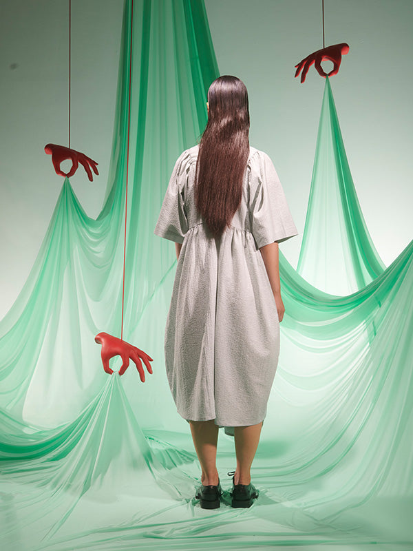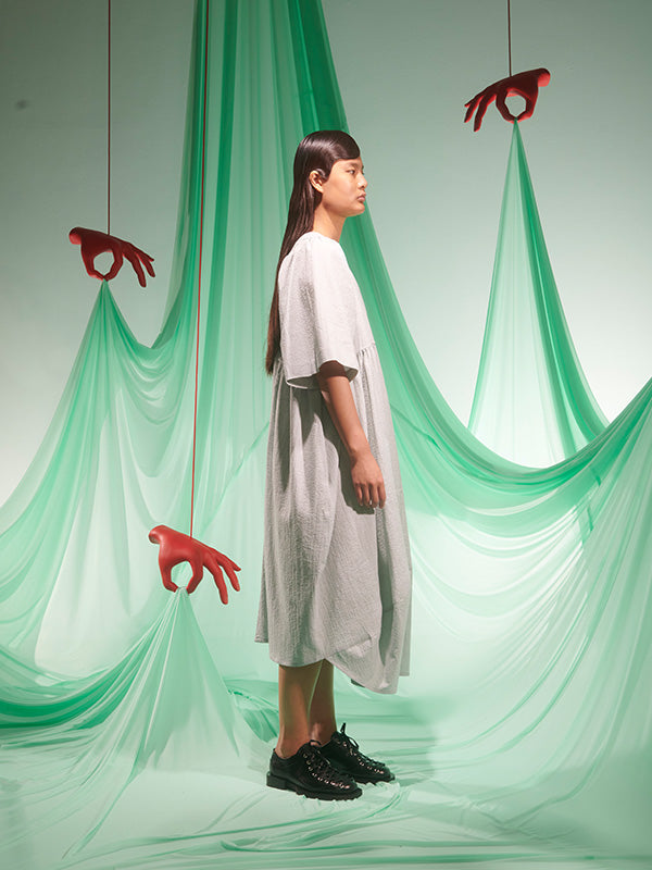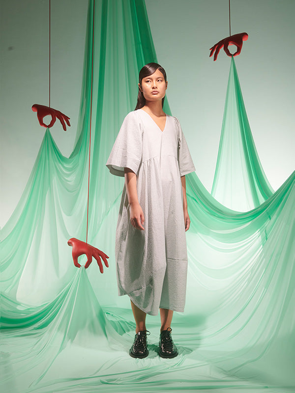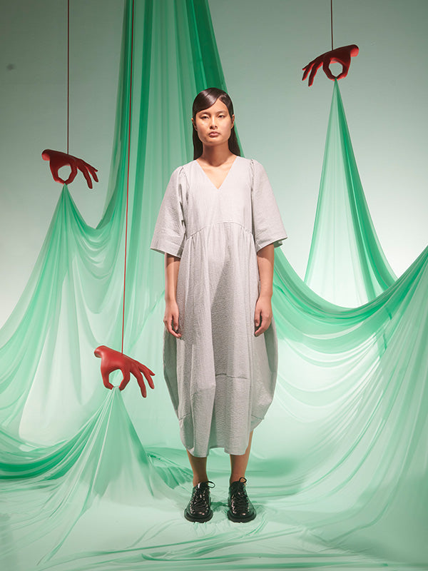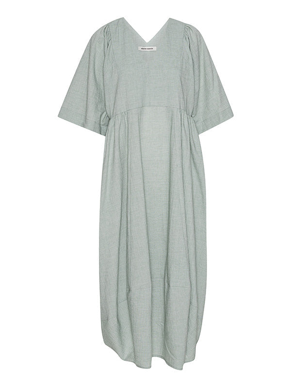 Pump Dress in Moss Green from Henrik Vibskov's SS25 Studio Collection 'The Orchestra of the Soft Assistance' Highlights - moss green - v-neck - draped design - short sleeves - curved hem Made in Bulgaria