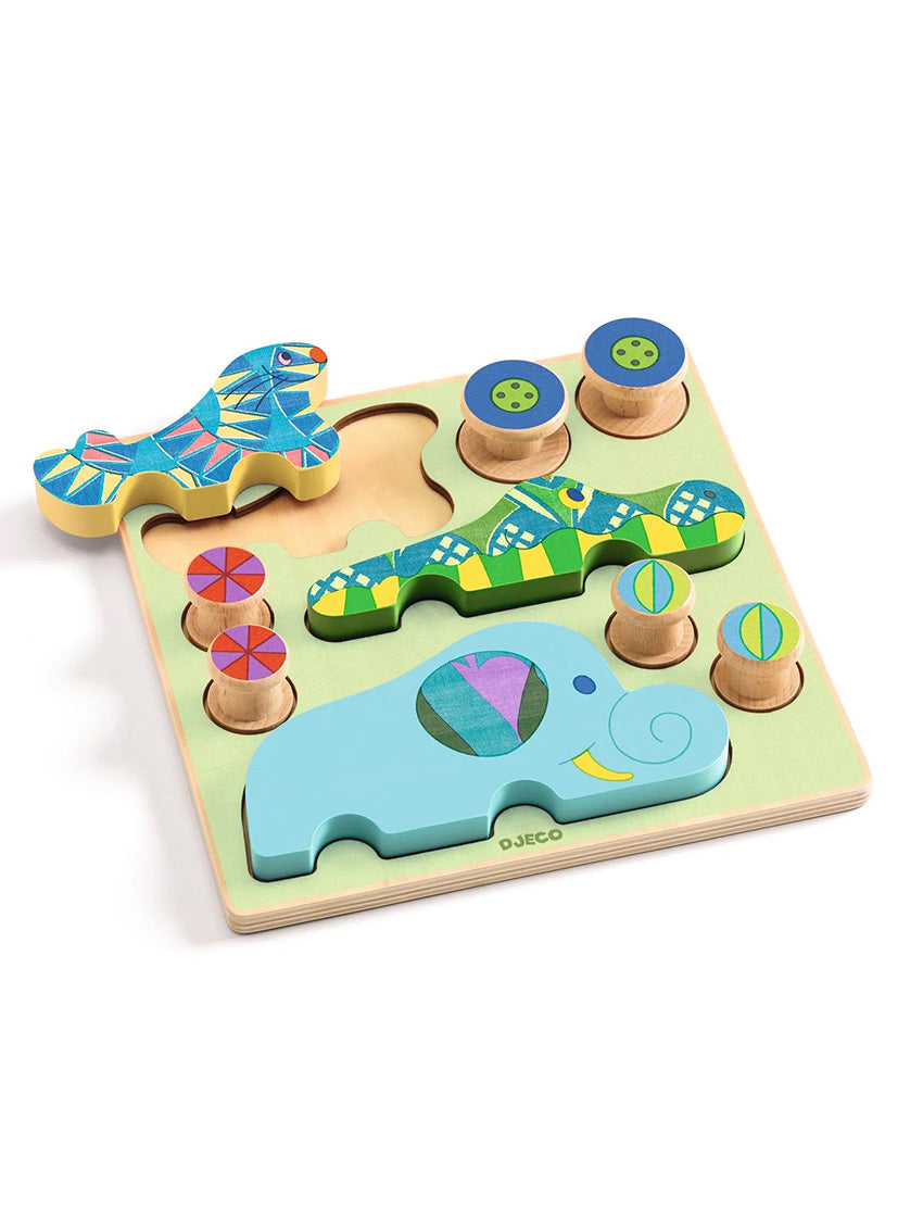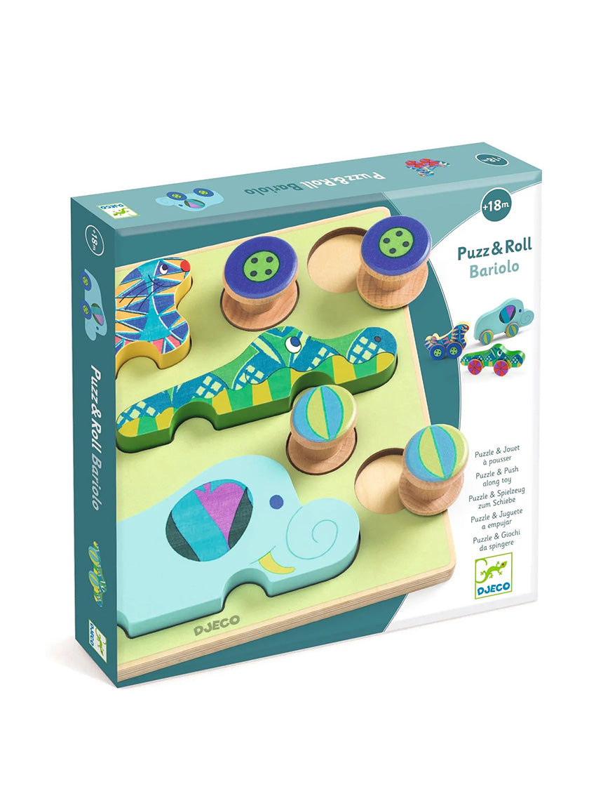Two toys in one beautifully designed set: The Puzz & Roll by Djeco is both a charming wooden puzzle and a rolling toy.