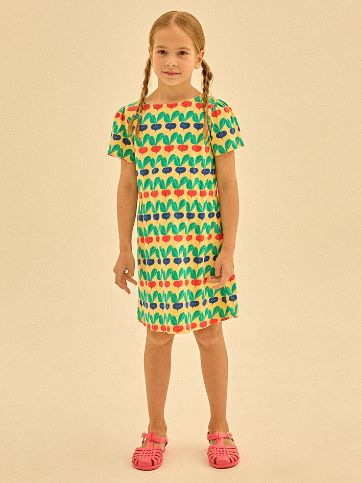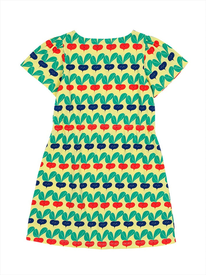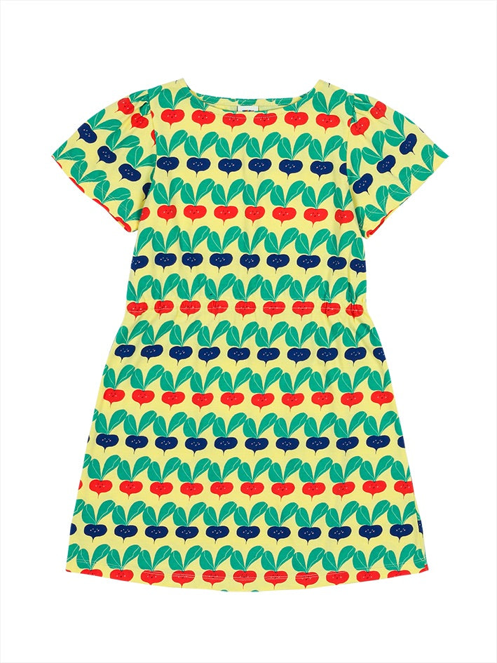 Short sleeve Dress in Yellow with Radish print by Jelly Mallow. Elasticated waist. Button opening below the neck. 100% cotton | made in China