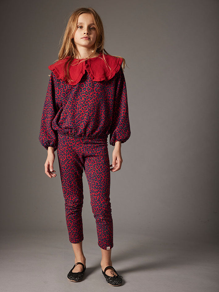 Red Velvet Animal Print Leggings by My Little Cozmo in premium brushed GOTS-certified organic cotton fleece. Designed with a soft elastic waistband and capri length for all-day comfort and easy movement. All-over animal print. Warm, cozy, and gentle on skin. Features Made from GOTS-certified organic cotton. Premium brushed fleece for superior warmth and comfort. Soft exterior and a toasty, cozy interior. Kind to both skin and the environment. A sustainable choice for your girl’s wardrobe. 94% organic cotton, 6% elasthane. Knit
