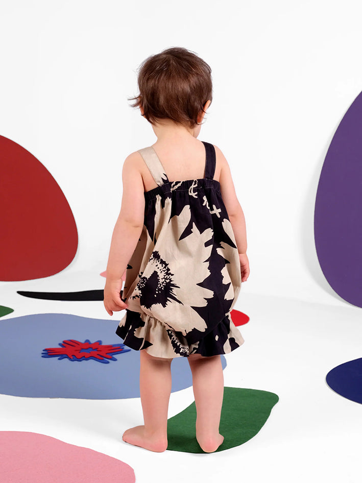 The Regina Baby Jumpsuit in Botanical Mocha by Wolf & Rita is a sleeveless jumpsuit with frills on the legs, back button and snap buttons between the legs, with small mascot embroidery 100% CO