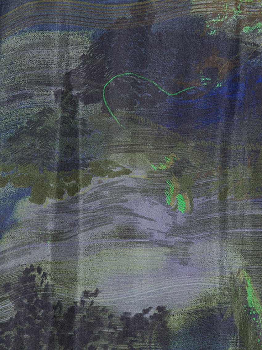 Signature fabric: This fabric is made in Turkey by Ipeker, a family owned textile company dating back to 1930. It is specially printed on a ‘vegan silk’ with a Henrik Vibskov artwork, showcasing fishermen catching fish in a mountain creek.