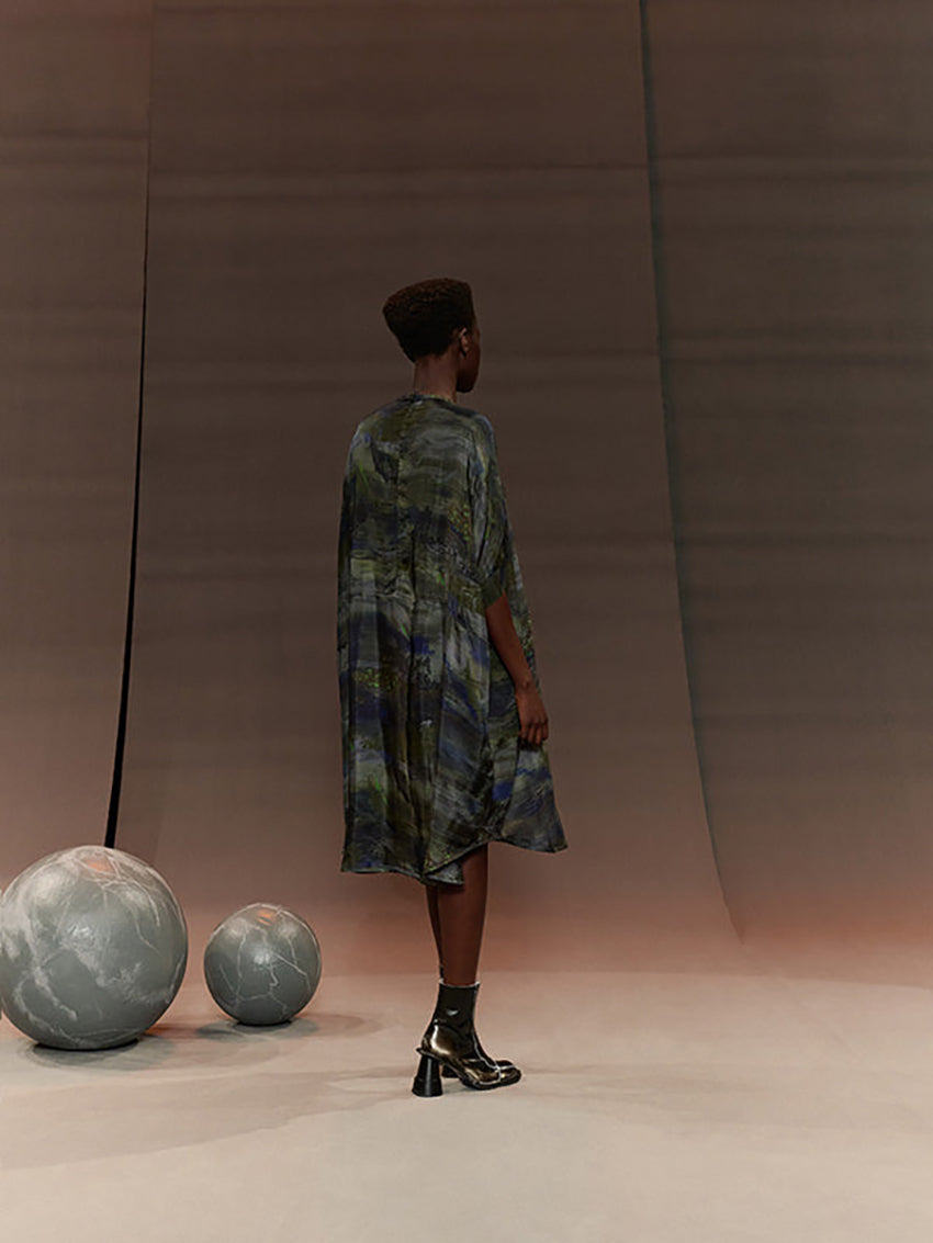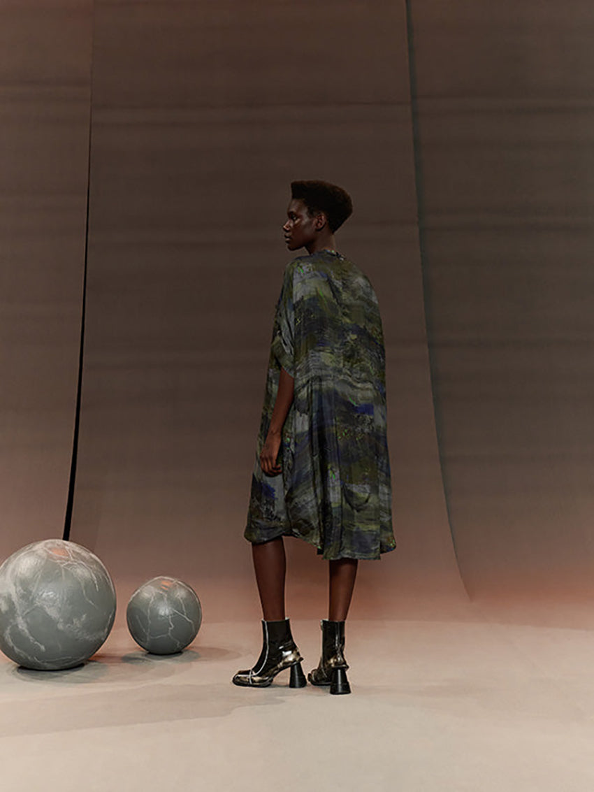 Renew Dress in Fishes Light print from Henrik Vibskov's Autumn Winter 2025 Studio collection "A Bit Overwhelmed by the Opaque Resonance".