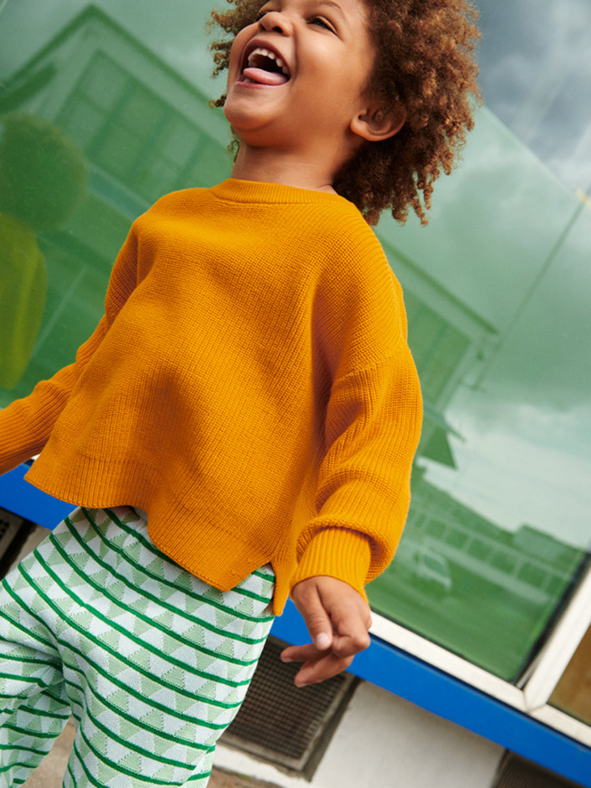 Knitted in a classic Rib structure, this long-sleeved Sweater in Sunflower by Fub has a loose fit, a round ribbed neckline, and small slits at sides. The sweater is designed with a spacious shape and is suitable for layering or to be worn on its own. It is made from organic cotton and is available in a solid color version and a striped version. 100% certified organic cotton