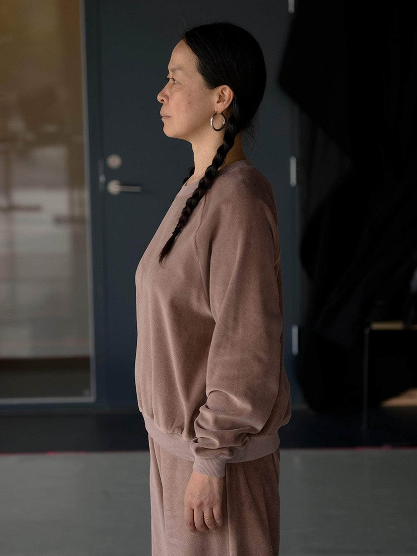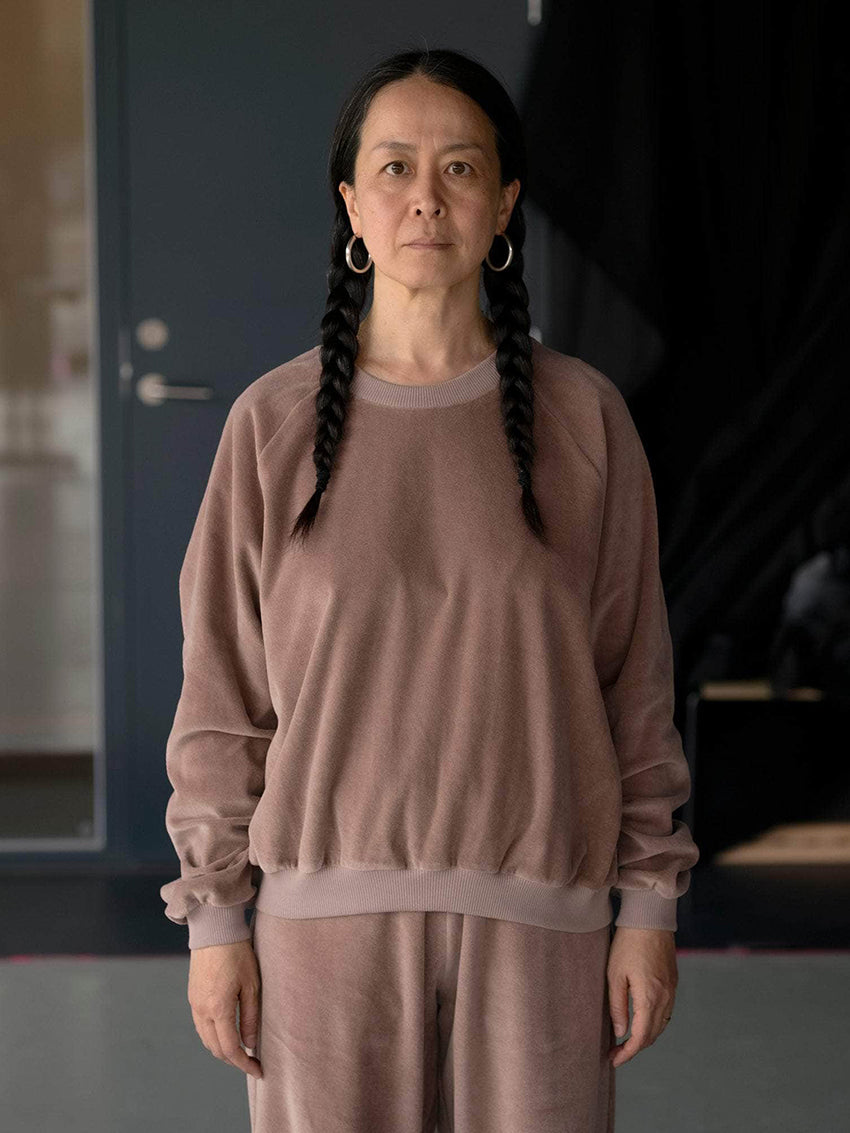 An organic cotton velour sweatshirt with a classic crewneck and raglan sleeves. Finished with ribbed collar, cuffs, and hem for a comfortable fit.