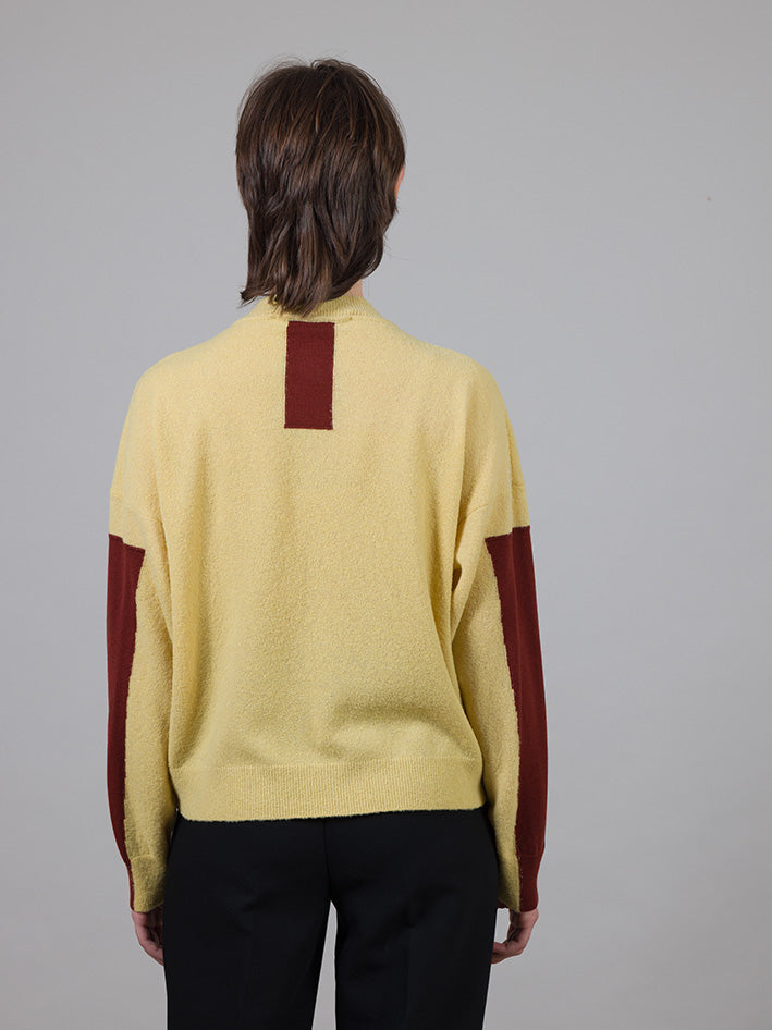 The Rona Sweater Vanilla by Franziska Lüthy fluffy look is due to the use of an ultralight bouclé yarn with tiny loops. The stability of the fibre is constructed of a hidden Polyamide core at the heart of the yarn. Along the forearms and the back of the neck are Intarsias that are inspired loosely by athleisure.