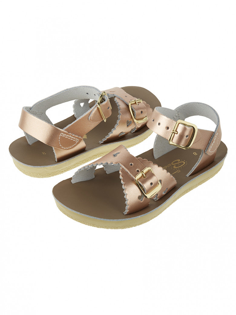 The Sweetheart is a super stylish Salt-Water Kids Sandal. Both beautiful and practical in deisgn - the entire Sun-San Sandal range comes on a comfortable spongy urethane soft sole with rust proof buckles. They can be worn in water and hand washed using a gentle detergent. This very pretty sandal with heart shape cut-outs and scalloped edges is now available in Rose Gold. The Sweetheart is fully adjustable with buckled toe and ankle straps.