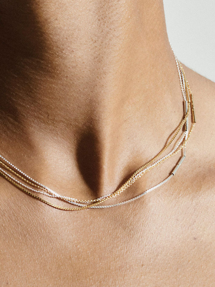 These Fine Necklace Cubic Gold by Saskia Diez give you just a subtle golden shimmer on your skin. They are simple and delicate. Material is 18karat gold. Variations are cubic for box chain, a chain made out of little cubes. Made in Munich.
