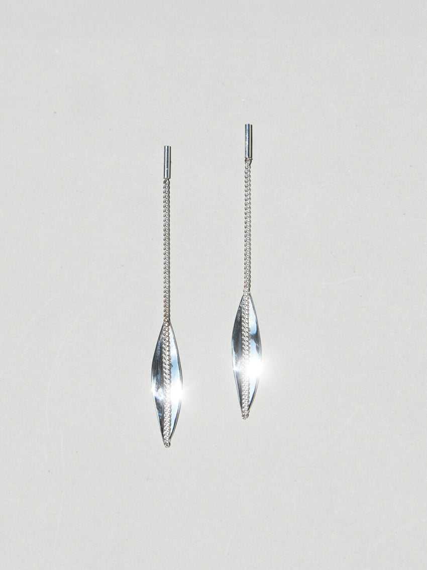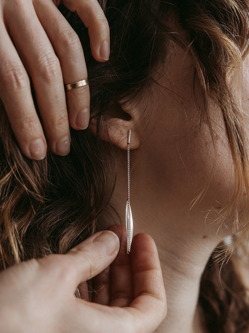 This earring is a delicate, nature-inspired piece that captures the lightness and elegance of organic forms. Suspended from a fine chain, the centrepiece resembles a stylised, elongated leaf, catching light as the wearer moves.