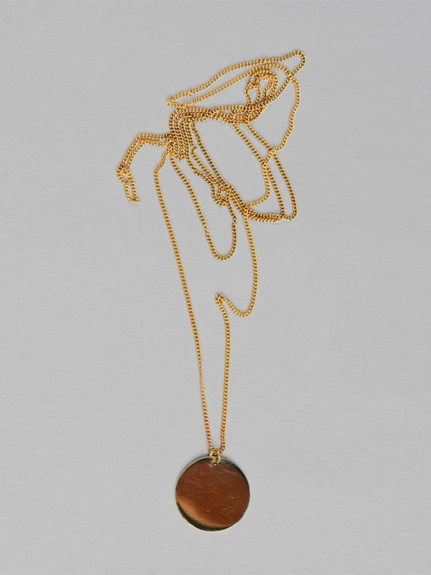 Delicate necklace with a polished flake. No clasp. Available in 14karat gold.