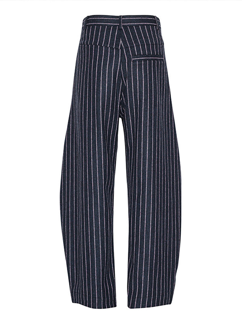 These pants feature a navy pinstripe, side pockets and a curved silhouette.