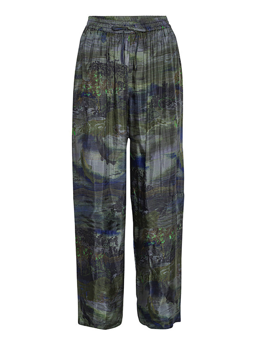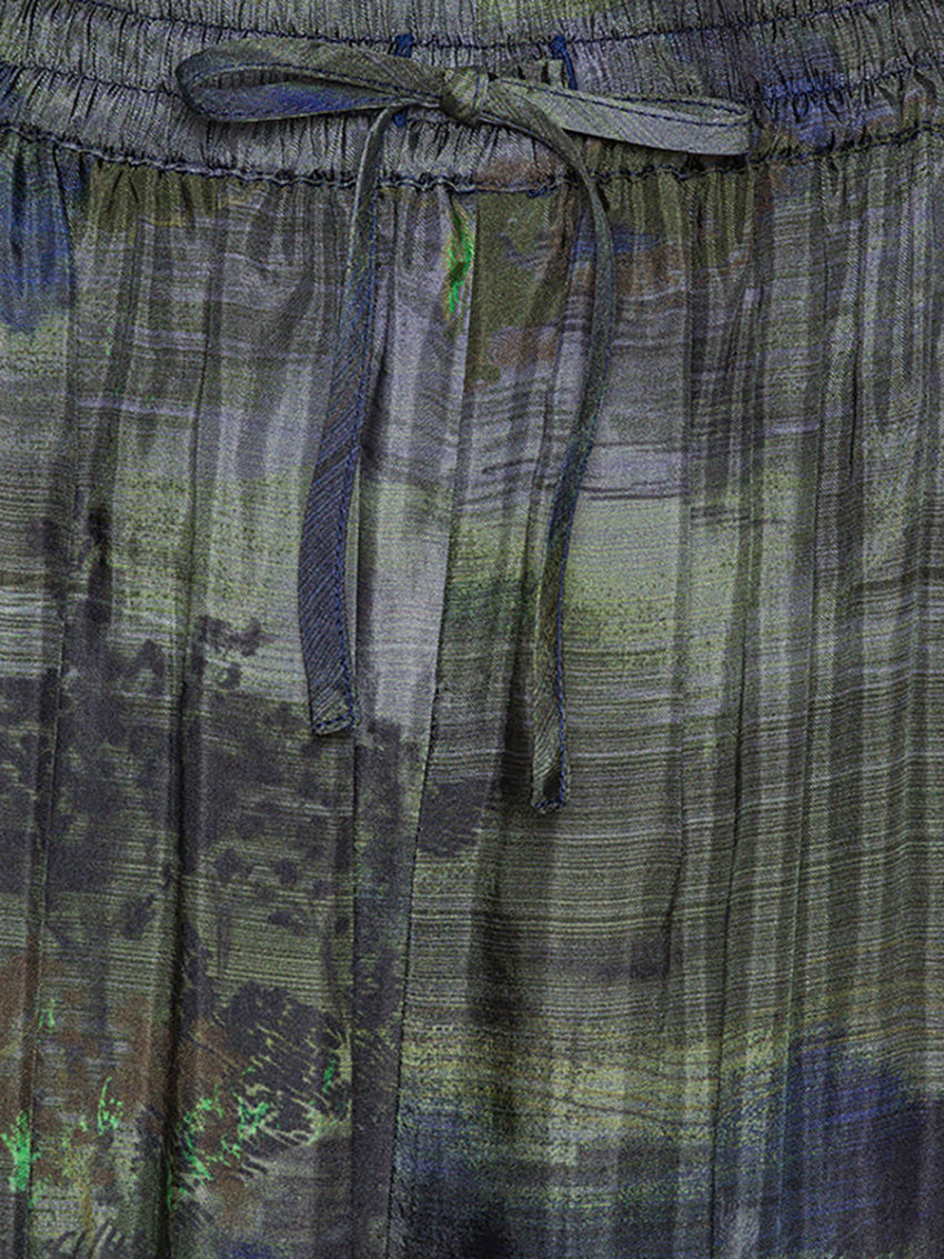 Features a multicolour dark nature print, elastic waist with drawstring, side pockets and loose fit.