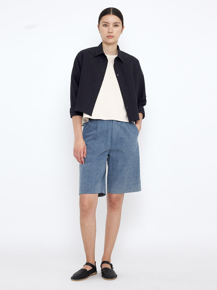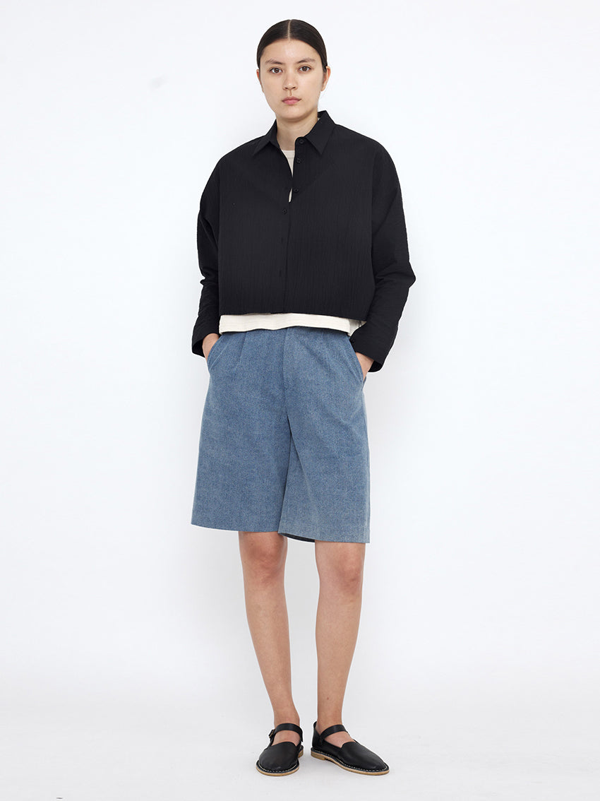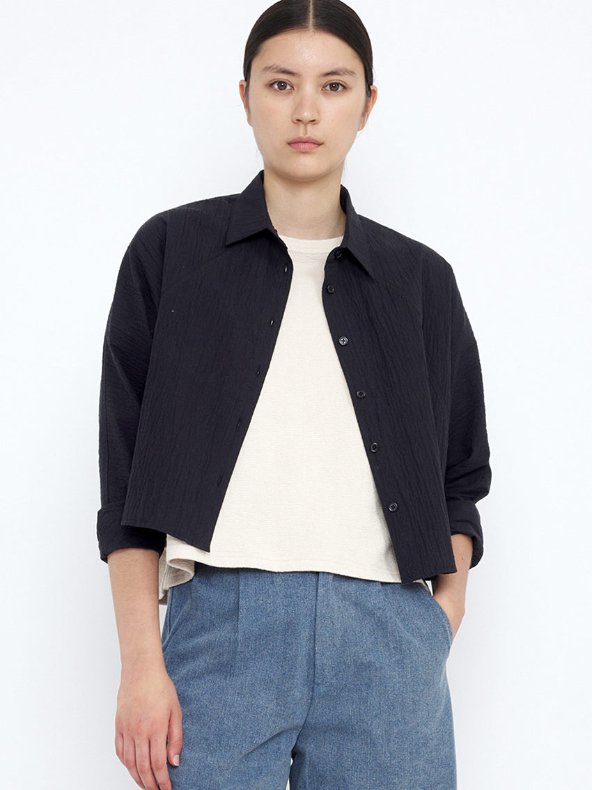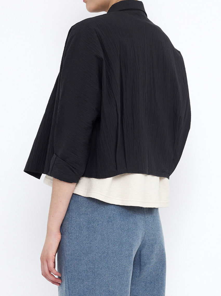 A thoughtfully tailored Signature 3/4 Cropped Shirt Jacket by 7115 By Szeki. Features a generously boxy fit, cropped length, dolman sleeves and a button placket. Paneled construction and a pleated hem. Color: Textured Black 99% Cotton, 1% Spandex Julie is 5’9” and wearing a S + Material A lightweight and airy cotton blended fabric that features a textured and lightly crinkled finish. Breathable, comfortable, and odor resistant.