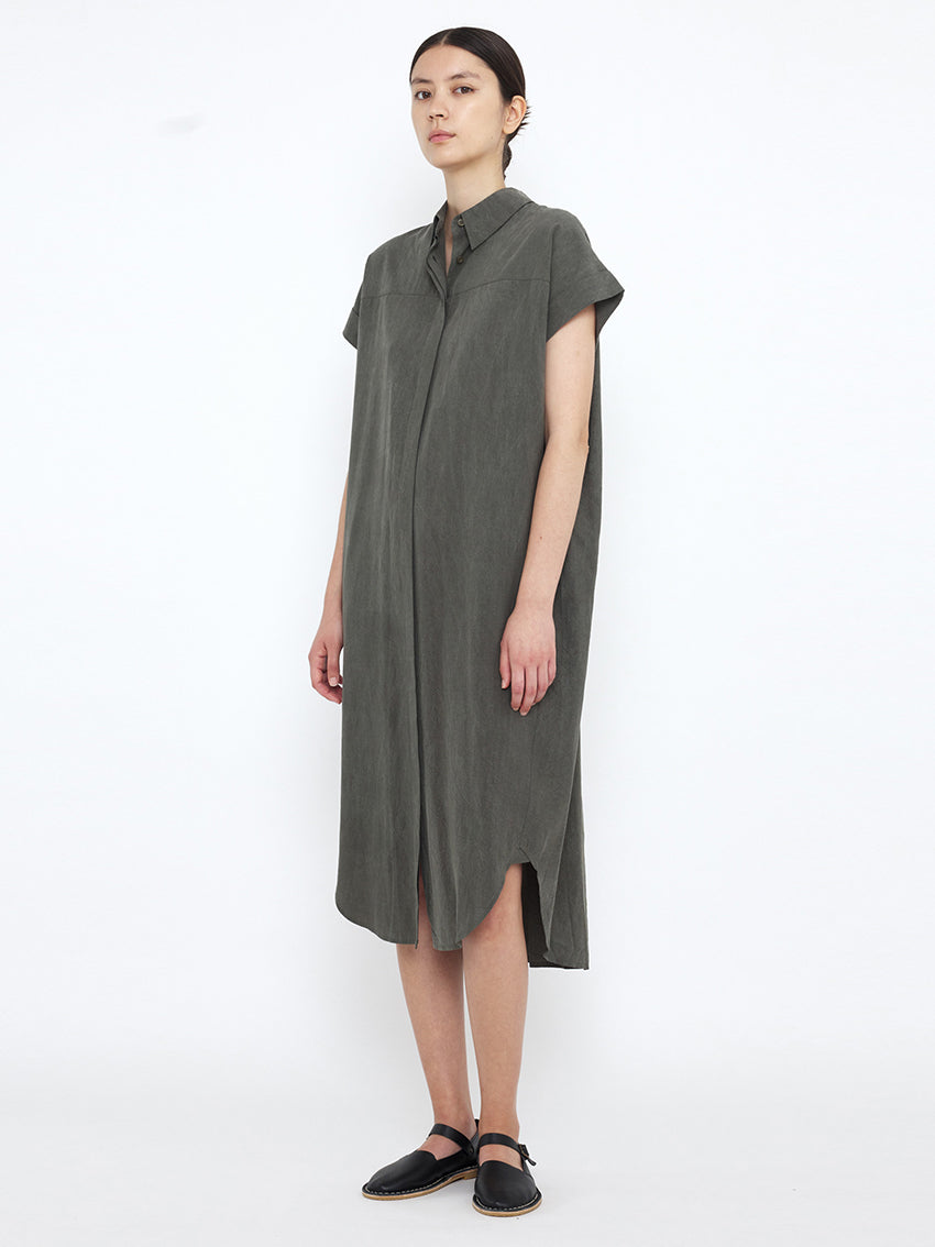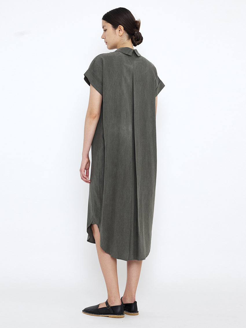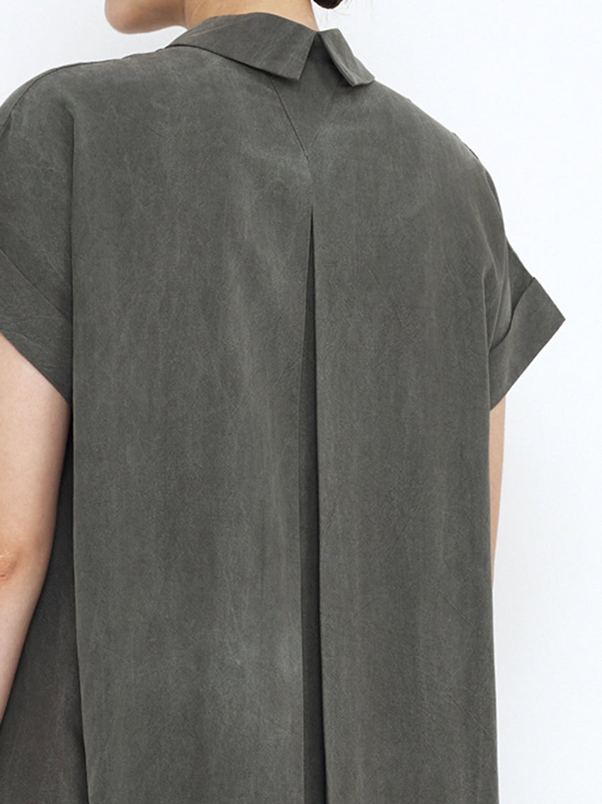 A sophisticated, everyday Shirt Dress in Pewter Green by 7115 By Szeki with soft, flowing drape. It features a boxy, loose fit, short sleeves, and a concealed button placket. It also features a box pleat at the back. Material: 100% Tencel