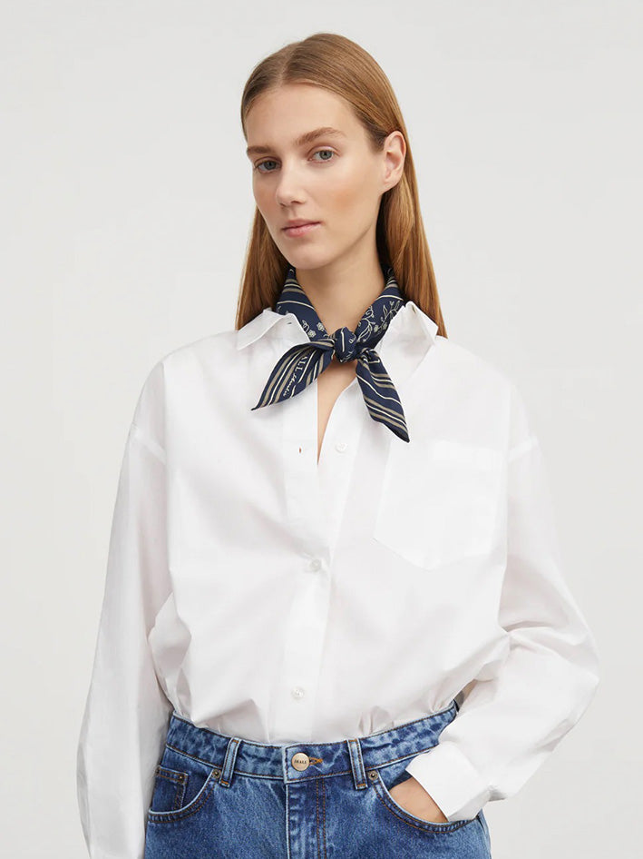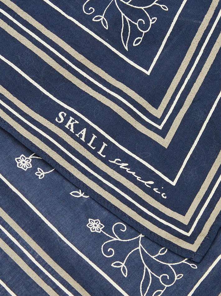 Skall Classic Scarf in Navy Beige and Cream The scarf is made in soft 100% organic cotton voile with a nice pattern. Wear it around the neck or in the hair. FABRIC AND CARE • 100% organic cotton voile • GOTS certified • Machine wash at max. 30 degrees • Produced in India Size: 55 x 55 cm.