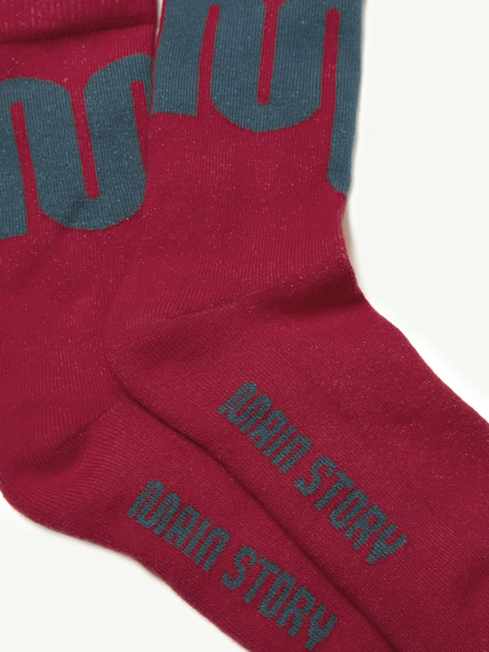 The mid-calf large squiggle jacquard Socks from Main Story in Cherry; made from a soft blend of organic cotton and recycled polyamide. Designed with comfort in mind, they have a plush inside sole for extra cushioning and comfortable toes. logo underfoot 80% Organic Cotton 18% Recycled Polyamide 2% Elastane Made in Portugal