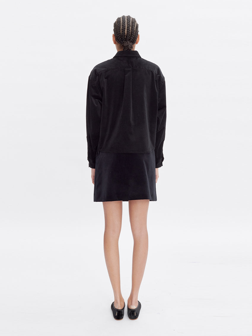 Loose cropped Black Corduroy Sophia Shirt from A.P.C. Cropped cut with a loose fit. Classic collar. Sloping shoulders. One pocket over the heart. Tone-on-tone buttons. 98% cotton. 2% elastane. Italian material. Made in Tunisia.