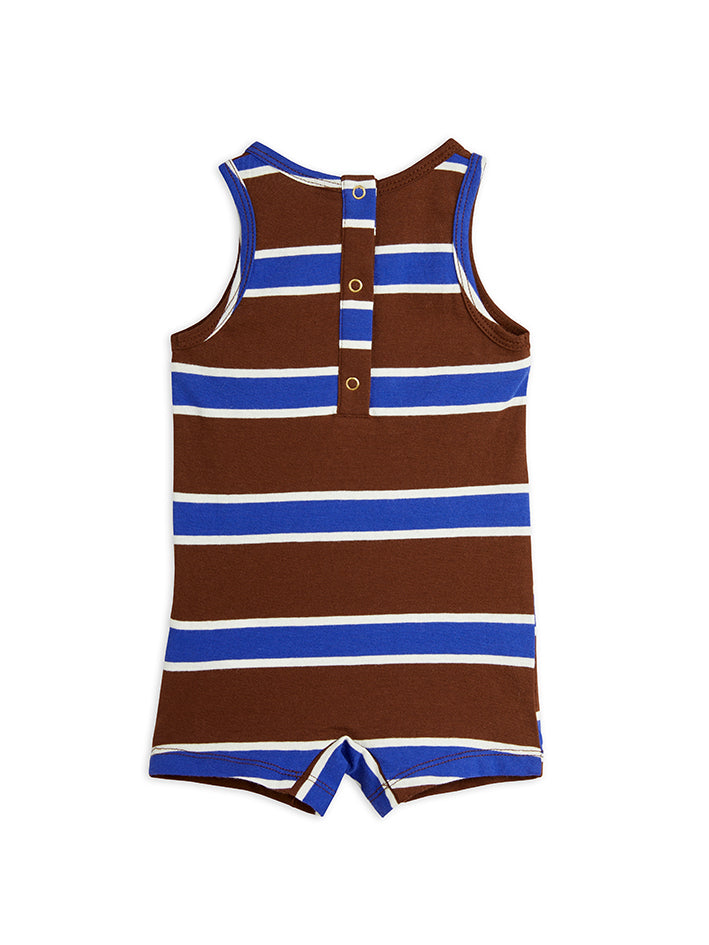 Baby Stripe Summersuit in Brown with snap button closure in the back. Baby playsuit made from 100 % GOTS certified organic cotton. Designed with a snap button closure in the back and finished with a Mini Rodini Panda label