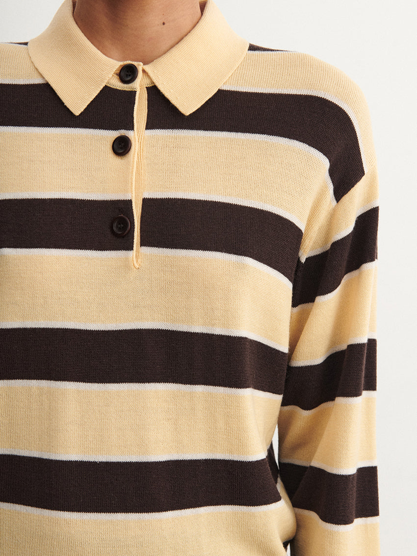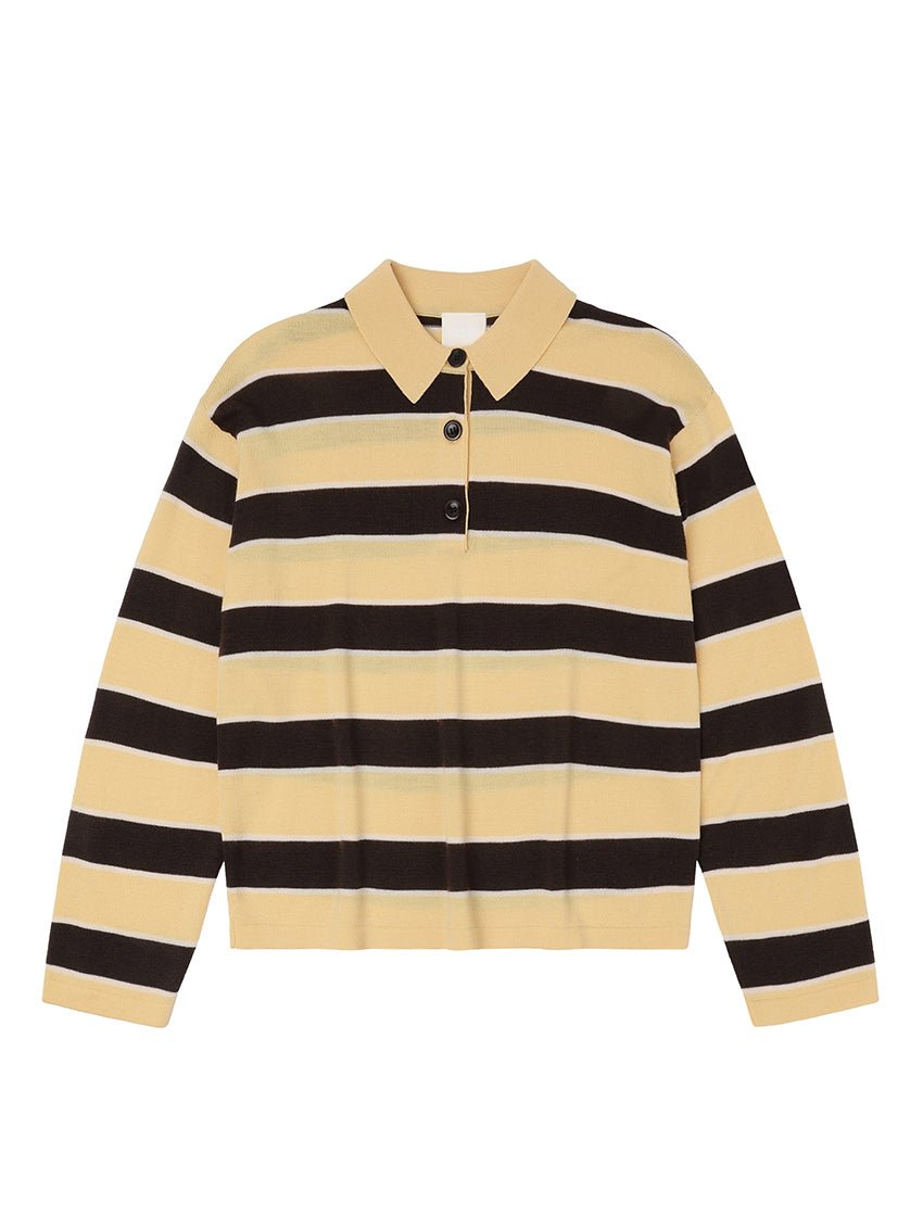 It is knitted in a soft single jersey with wide stripes and features front button closure with corozo nut buttons and folded hems.