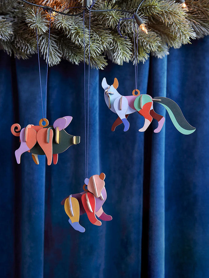 The ornaments by Studio Roof will bring color and charisma to any tree or mantle! Made from high-quality recycled cardboard, Studio Roof's creations come flat-packed, ready to be assembled in their new home.