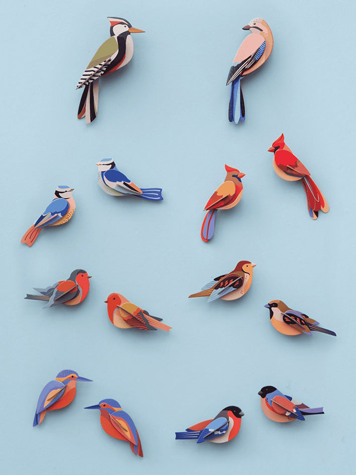 Garden birds chirp around us, pecking at some crumbs, glancing around, then fluttering away. They add color to our daily lives. These cardboard blue tits won’t fly away and can be given a lovely spot on your wall.