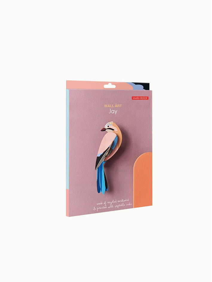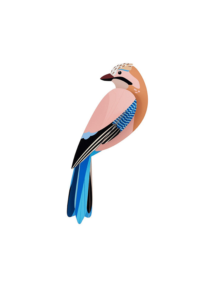 Garden birds chirp around us, pecking at some crumbs, glancing around, then fluttering away. They add color to our daily lives. This cardboard jay won’t fly away and can be given a lovely spot on your wall.