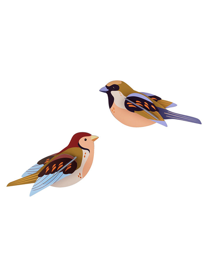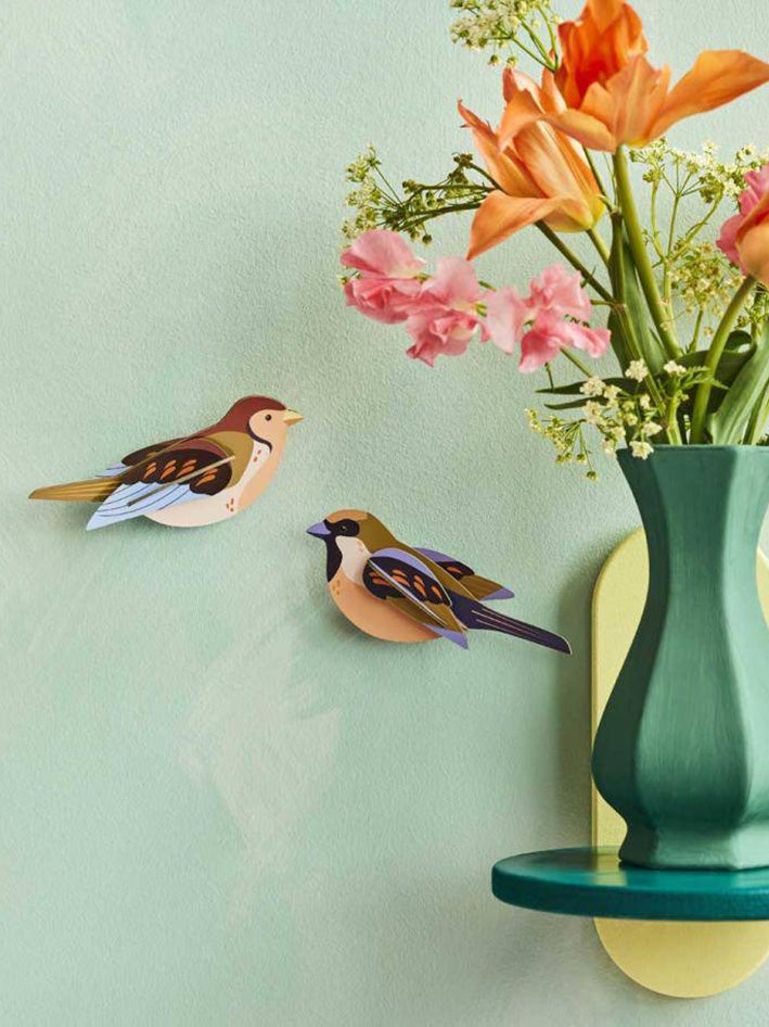 Garden birds chirp around us, pecking at some crumbs, glancing around, then fluttering away. They add color to our daily lives. These cardboard sparrows won’t fly away and can be given a lovely spot on your wall.