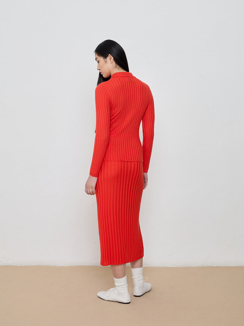 Pull-on skirt in evenly ribbed Merino wool knit.