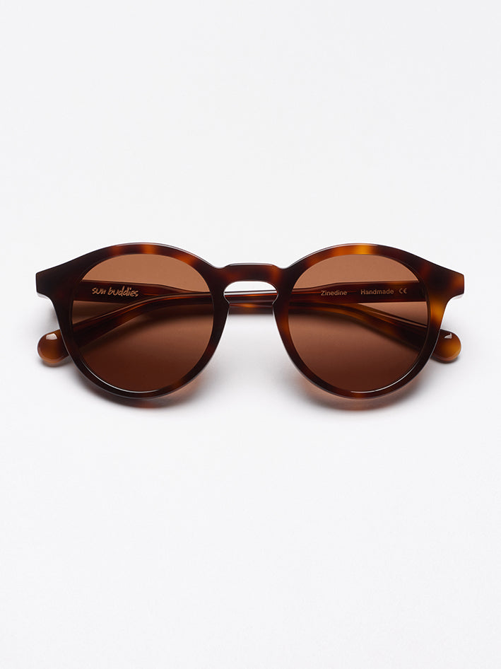 The Zinedine Sunglasses Tortoise from Sun Buddies has the Measures 48 x 23 x 140 millimeters. Original tortoise patterned vintage inspired biblio frame in brown and yellow. Handmade of Italian acetate. Brown Carl Zeiss lenses with 100% UV protection and a five bar hinge with two visible rivets on temple. Comes in a luxurious faux leather hard case and a glossy paper box. Cleaning cloth included.