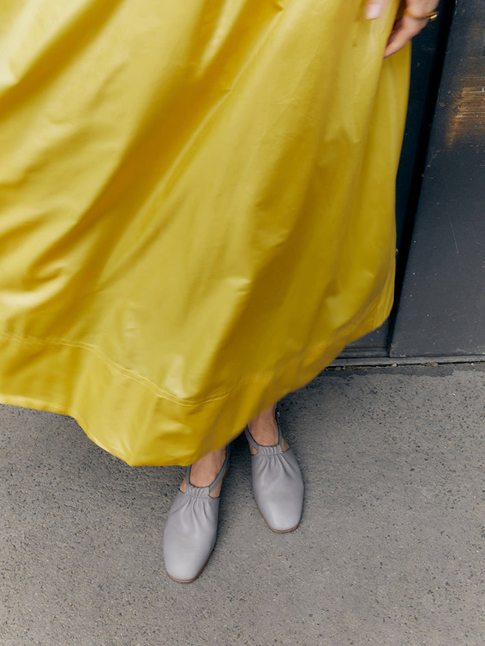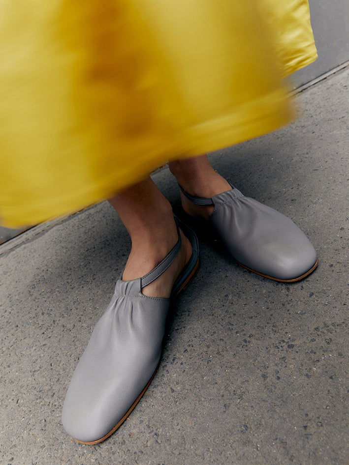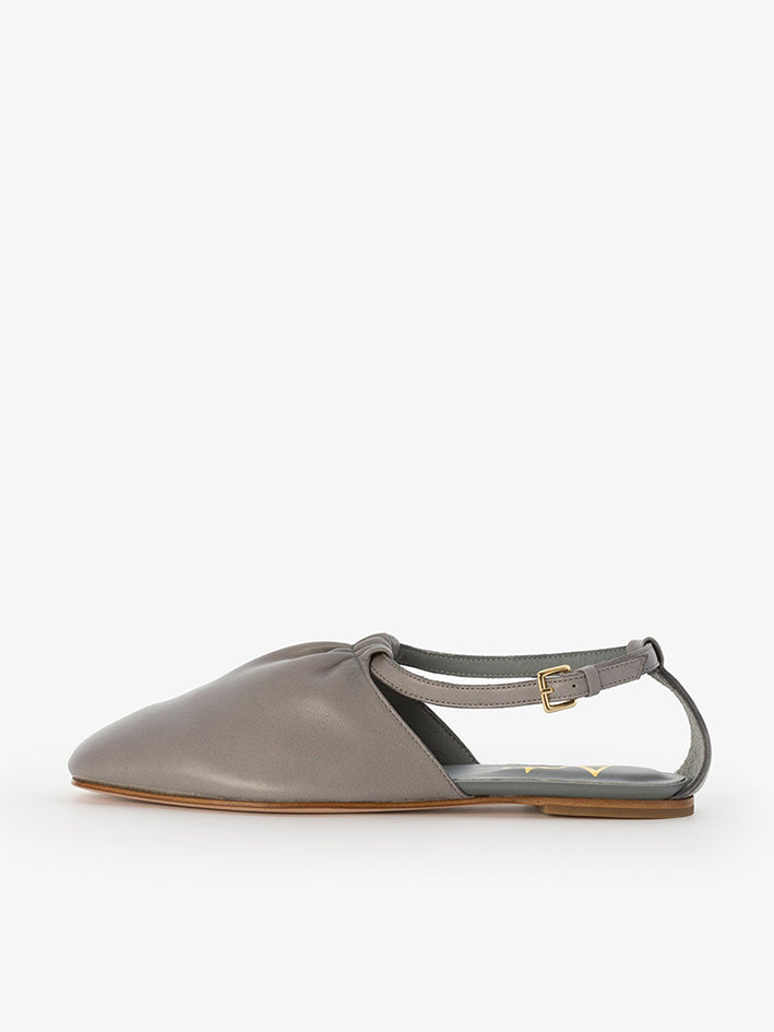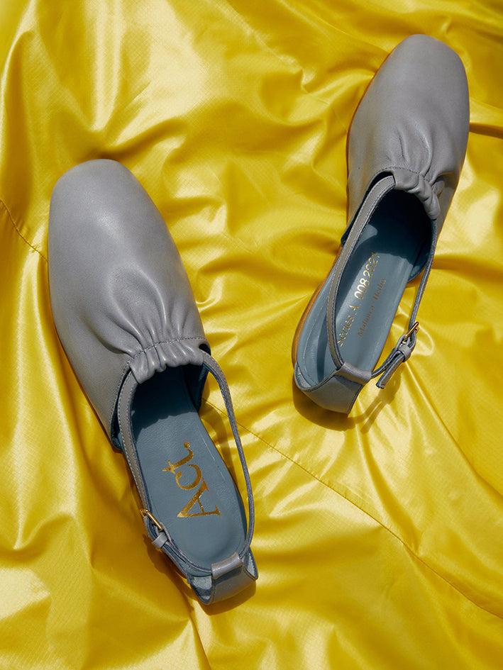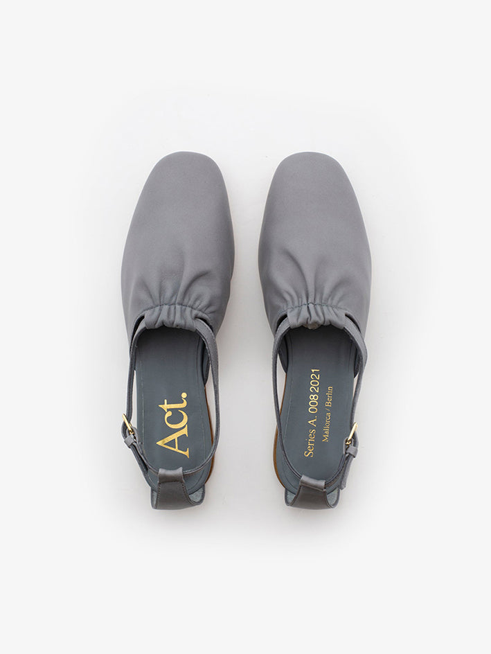 Grey calfskin leather Svedja Ballerina Flats with square toe and wrinkled frontal closure. Strap- fastening at the ankle with a delicate buckled strap on the side. Cushioned padded leather insole and nubuked leather sole. All of the leather and suede shoes are made by hand with only the best quality fabrics and leathers. Resulting it in small variations in color and details, that makes each of Act Series items so unique.