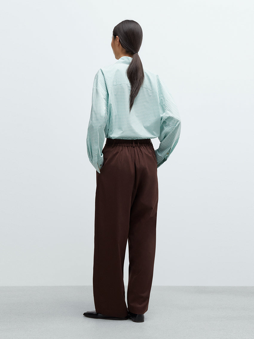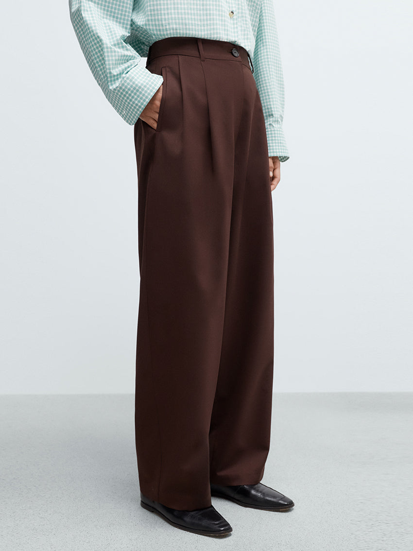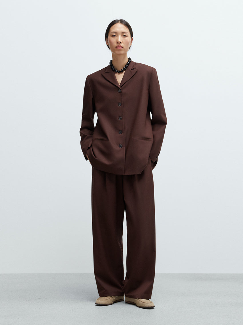An elevated update of our iconic Tailored Masculine Pants, now featuring a higher waist and refined proportions for an even more flattering silhouette. Crafted from high-quality fabric with a timeless burgundy tone, they maintain their signature loose, masculine fit with a mid-rise and double front pleats for added structure. Details include jetted side pockets, back welt pockets, an elasticated waistband at the back, zip and button closure, and belt loops. A year-round essential designed for effortless, modern dressing.