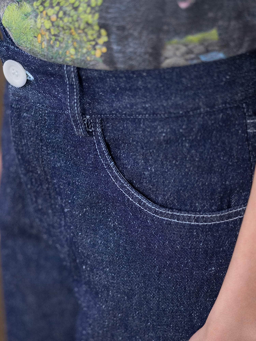 Silk-cotton denim pants with a mid-rise fit, featuring two front and two back pockets, belt loops, and a button closure.