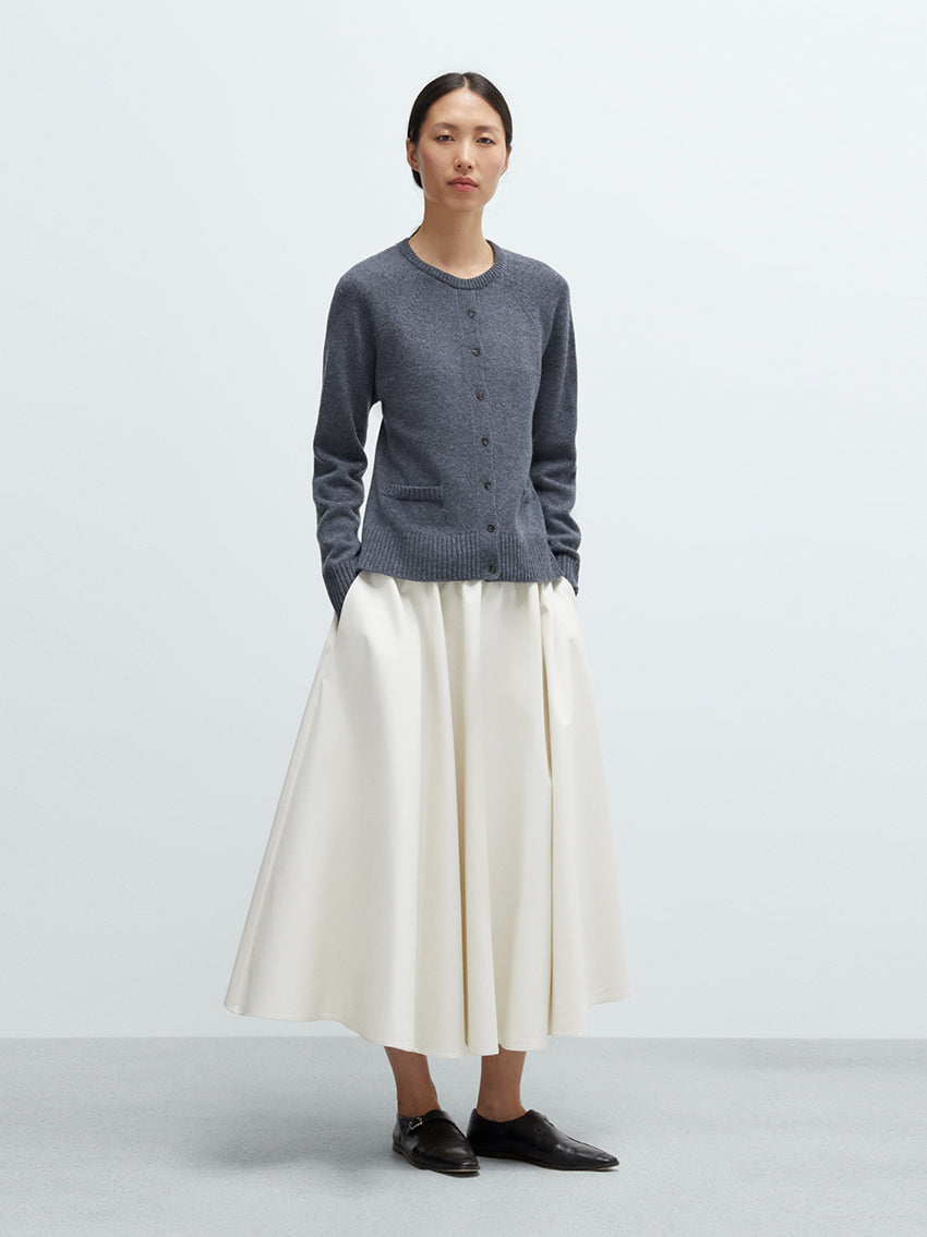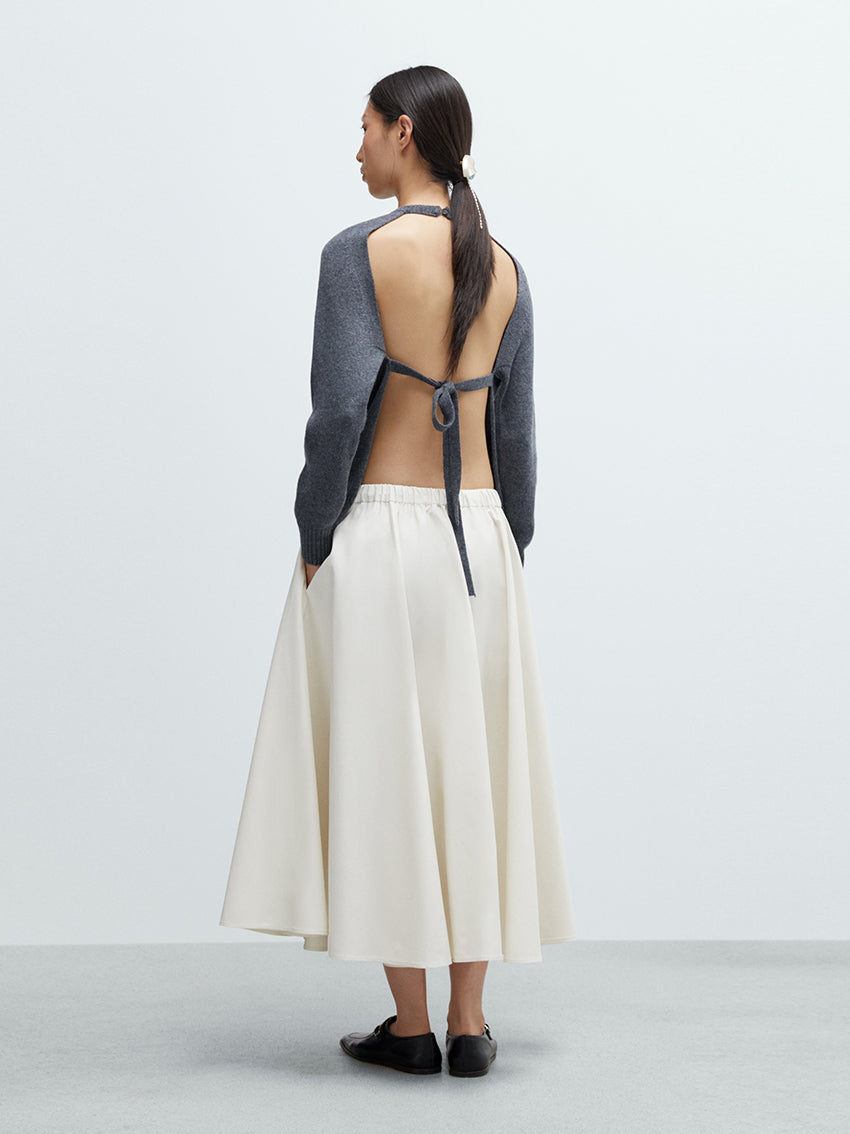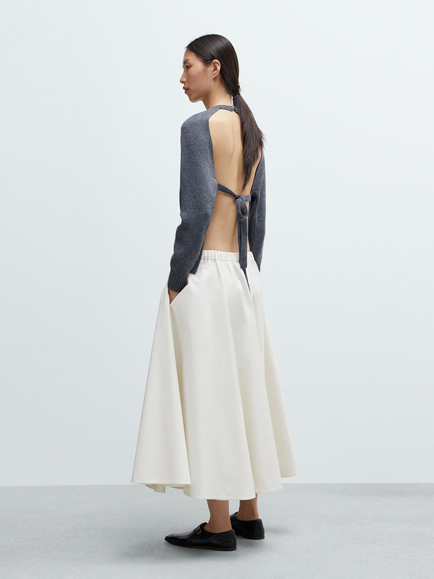 This skirt is designed with a mid-length circular shape and crafted from a technical fabric. It features an elasticated waistband with a sporty drawstring and contrasting cord and side pockets. The skirt’s weight adds elegant movement and volume to your look.