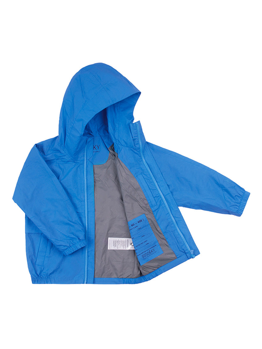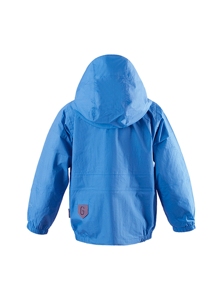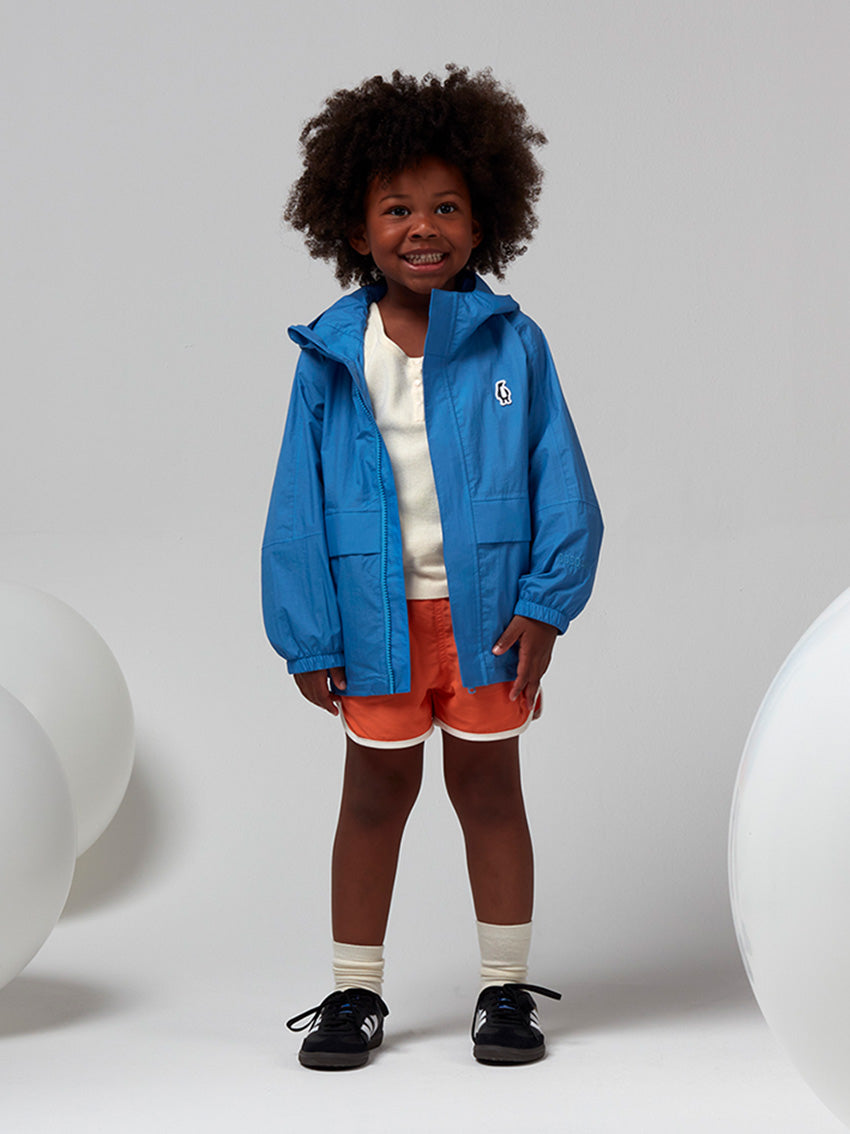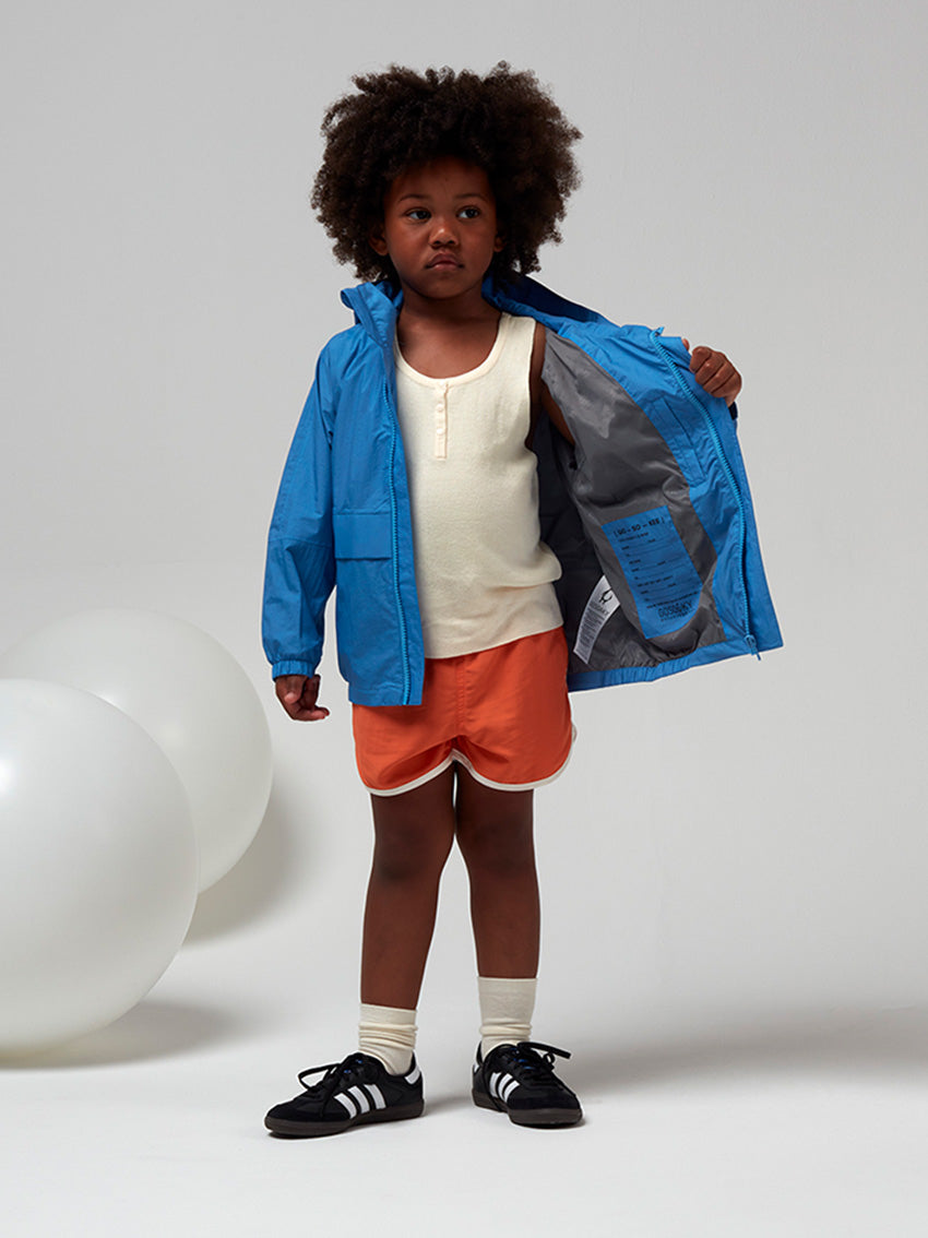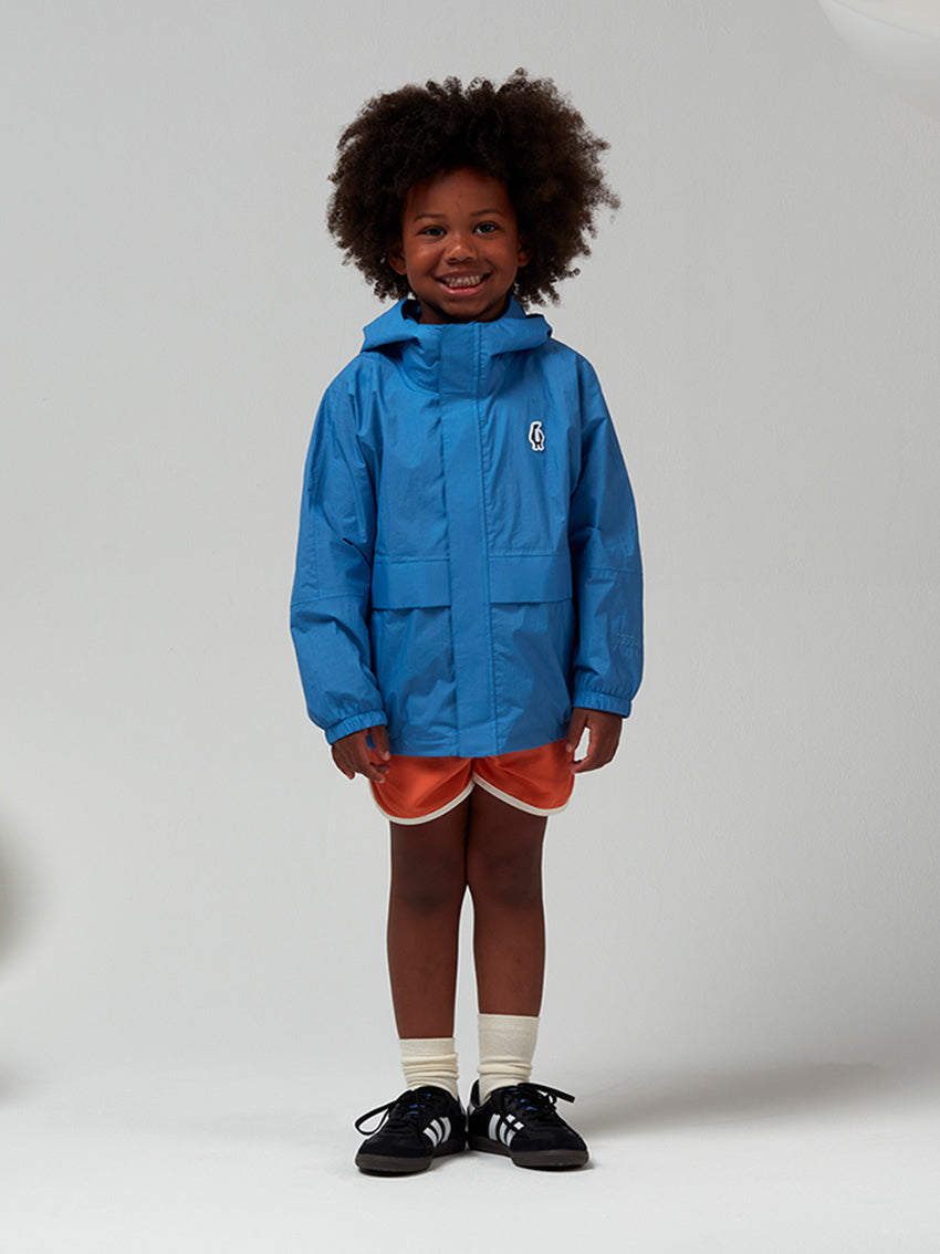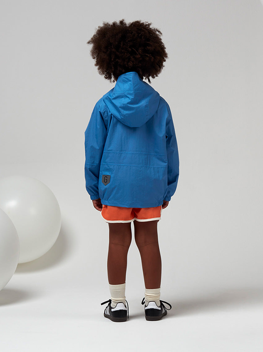 This short performance-ready Jacket in Azure Blue by Gosoaky is an essential for kids on the go. A special cut of the armhole and sleeve give the silhouette a clean and modern look. THE LION’S material blocks out outside moisture, from small drops to big storms, whilst still letting through the body’s own vapor to regulate heat. WATERPROOF This breathable material has a waterproof coating up to 8000mm column pressure to endure heavy rainfall. An extra durable Bionic finish®Eco water repellent finish (fluorine free) has been applied so that water simply glides off the material. All seams have been hermetically taped so no water can penetrate the garment. High performance material Summer Nylon Penguin logo patch on front All their garments are BPA + AZO free and certified with all child safety regulations No animals are used for these products