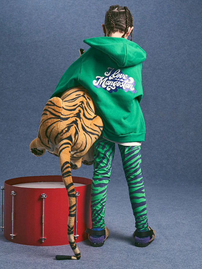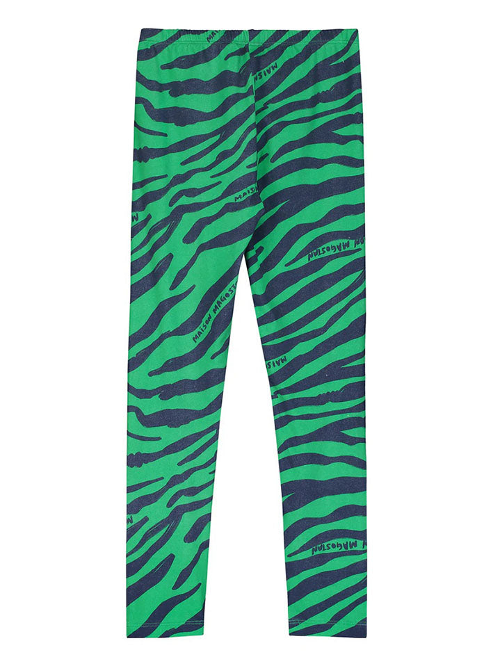 The Tiger Leggings in Mentha green and blue by Maison Mangostan feature a bold animal print and have an inner elastic waistband for better comfort. Composition: 95% Organic Cotton, 5% Elastane This item is normally sized, we suggest you select your regular size.