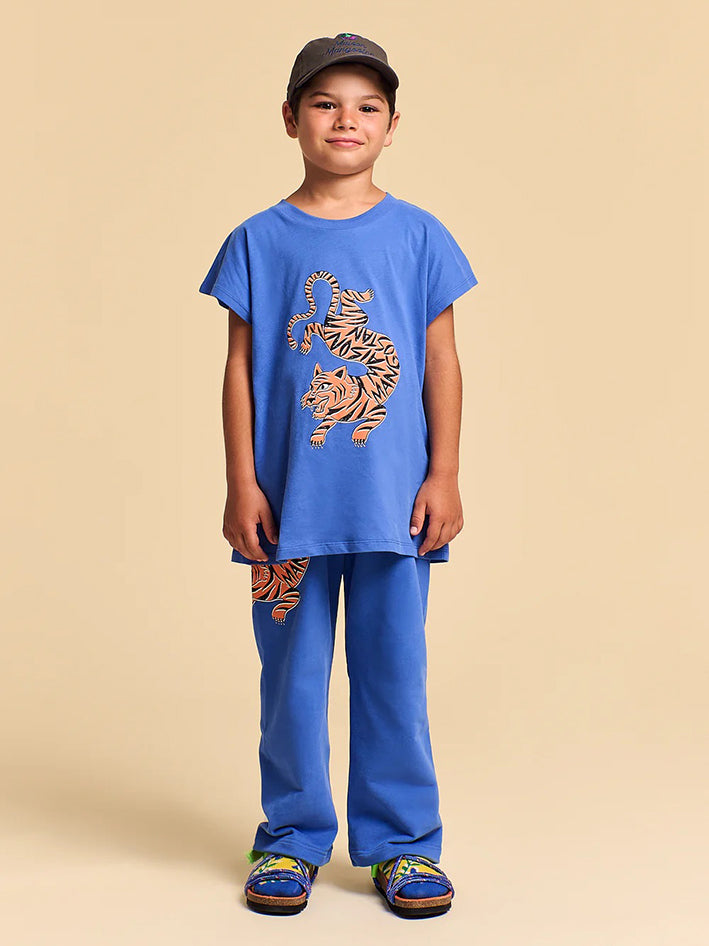 The Tiger Sweatpant in Blue by Maison Mangostan offers a relaxed fit in soft cotton fleece, featuring a fierce tiger print on the front. The elastic waistband ensures comfort all day long. Made in Portugal. Composition: 100% Organic cotton This item is normally sized, we suggest you select your regular size.