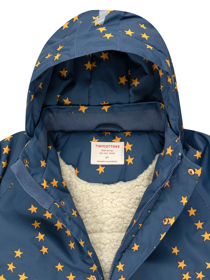Welcome to the slopes of Tinycottons Chamonix with The Tiny Stars Snow Jacket in Light Navy! This technical piece will keep your little ones warm and dry on the ski slopes and beyond! The jacket features a sherpa inner panel and pockets for extra warmth, a removable hood, rib cuffs, a full zip with soft fleece zip guard, an inner adjustable waist for the perfect fit and reflective strips on the arms and hood for added safety. Are you ready for your next adventure? À bientôt! Composition: exterior: 100% polyester lining: 100% polyester padding: 100% polyester