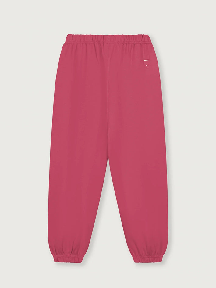 This loose-fitted timeless style is made from a soft organic cotton fleece. These unisex Gray Label Track Pants in Cherry have an elasticated waist with adjustable drawstring and elasticated cuffs with welt pockets at the sides. The logo is stitched on the right back, just below the waist. 100% Organic fleece cotton Made in Turkey