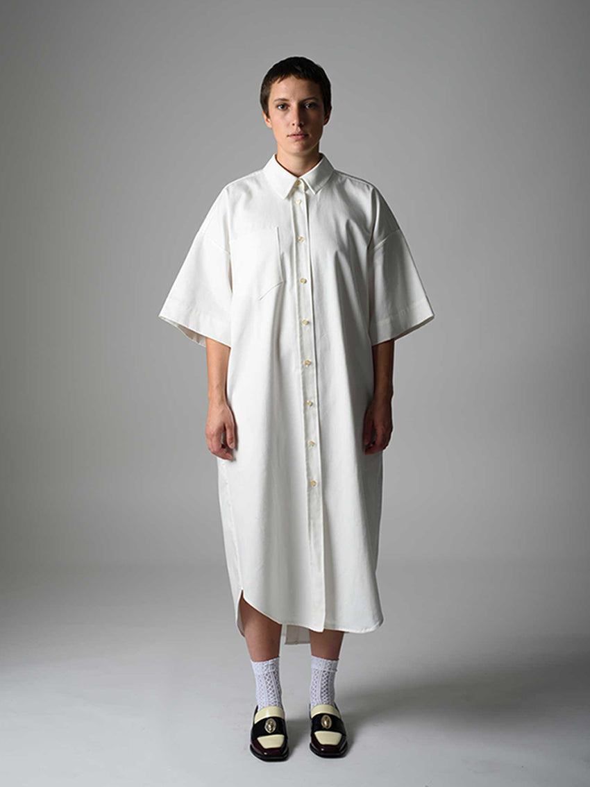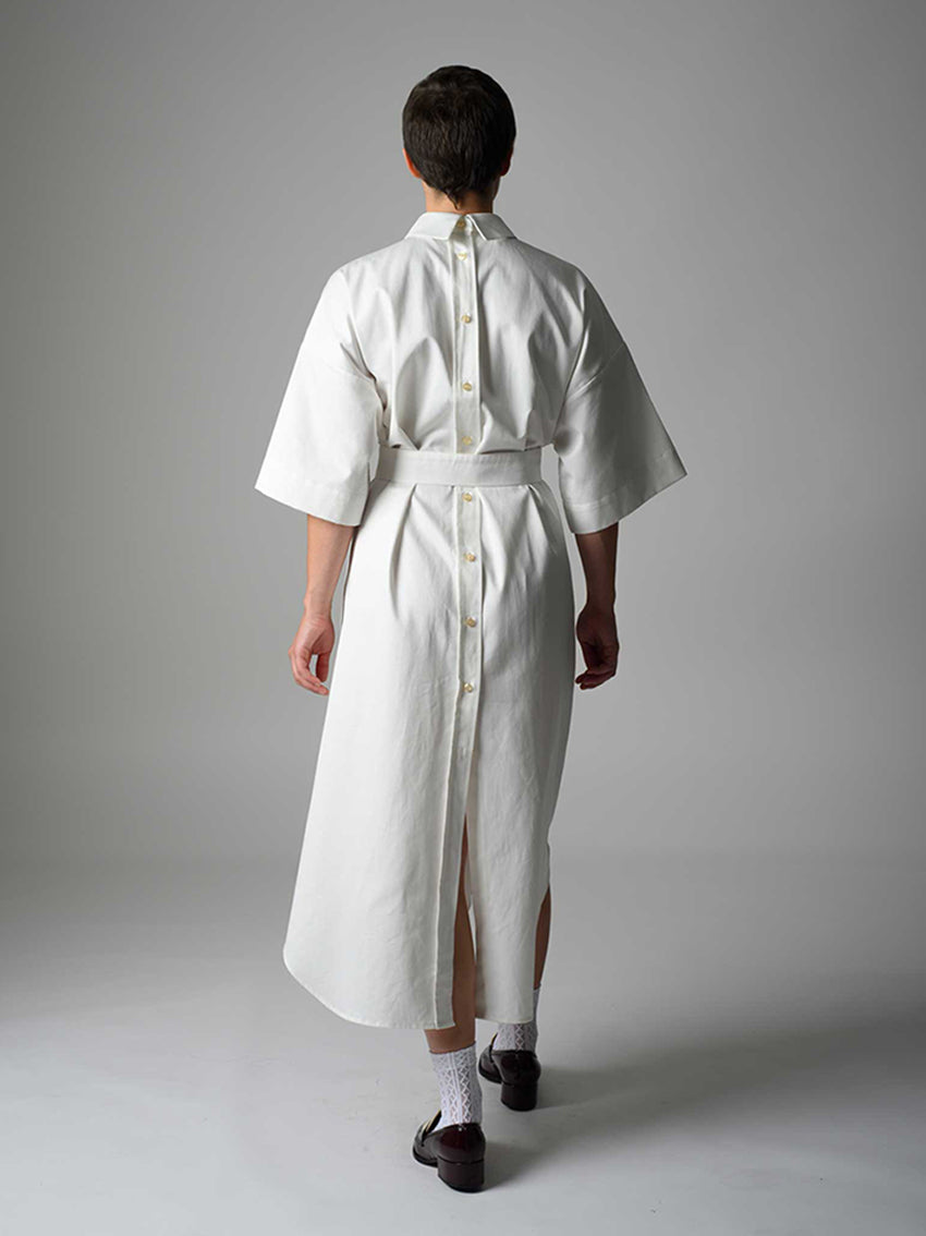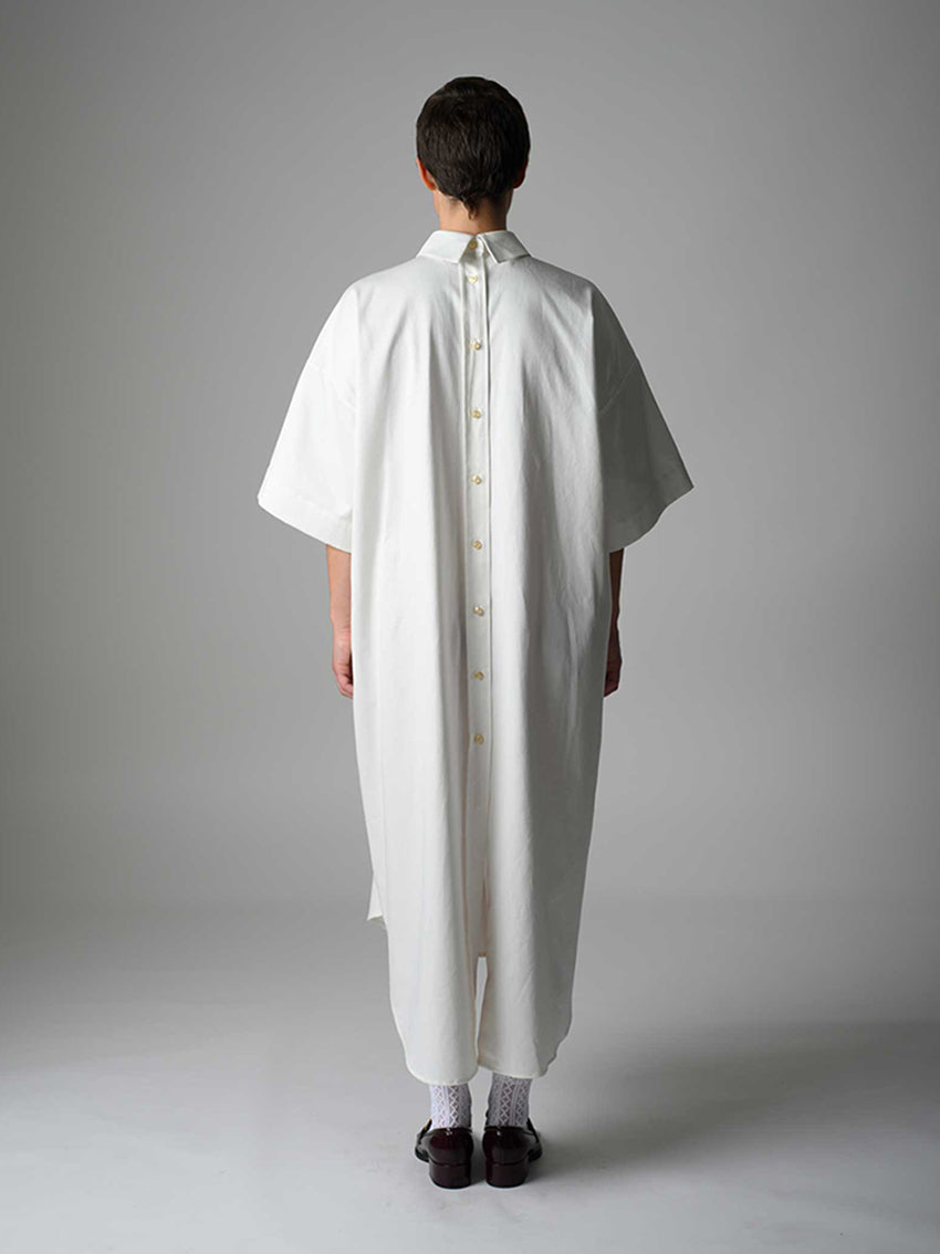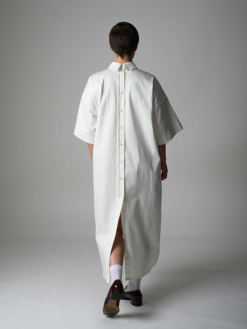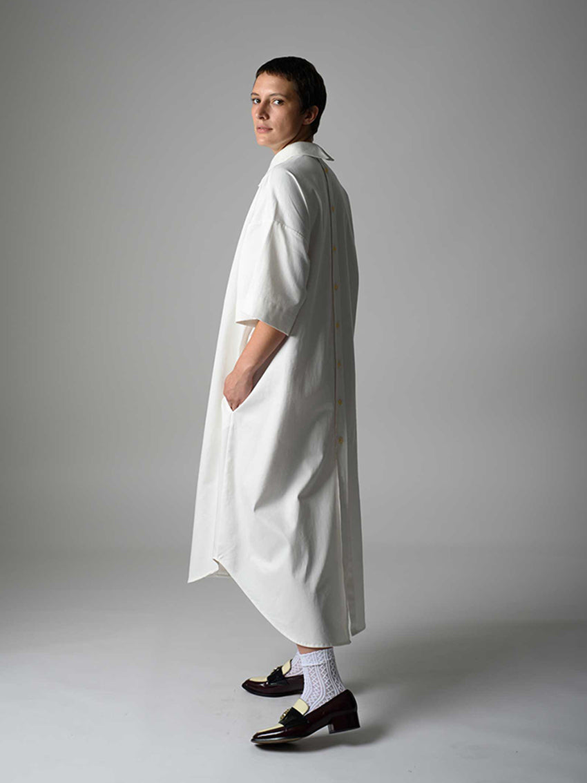 Oversized cut dress with functional button rows at front and back.