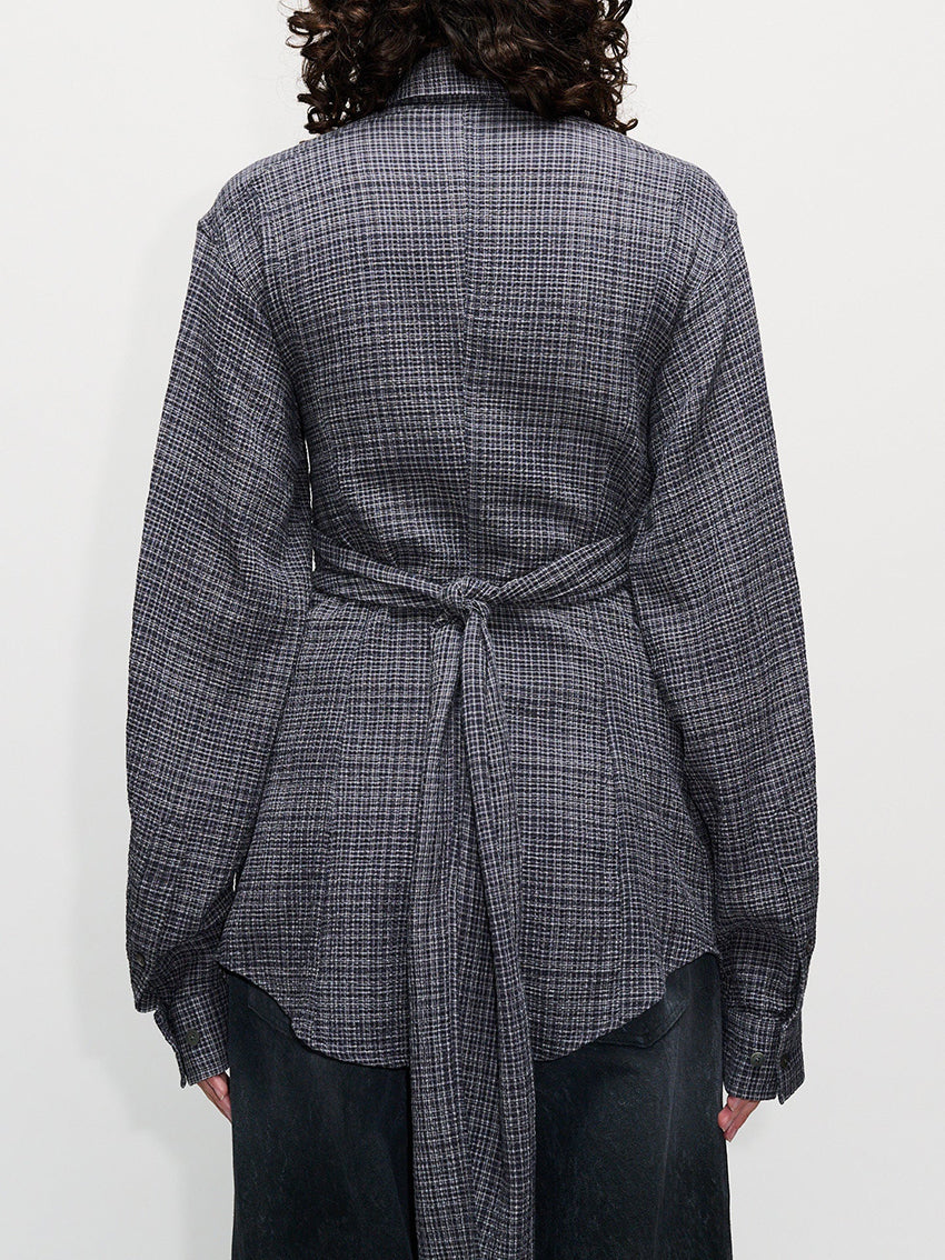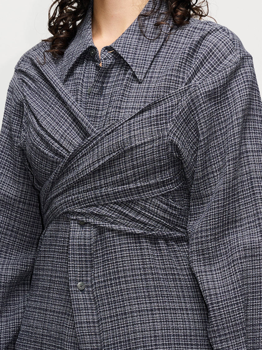 The Hope Twisty Shirt in Grey features a slim fit with a draped wrap construction. It is crafted from grey Micro-Checked seersucker cotton fabric. Details include elongated twisted sleeves that end with a regular cuff. - Regular collar - Slim fit - Wrap detail at waist - Twisted sleeve - 98% Cotton, 2% Elastane - Model is 173 cm / 5´8" tall and wears a size WOM 36