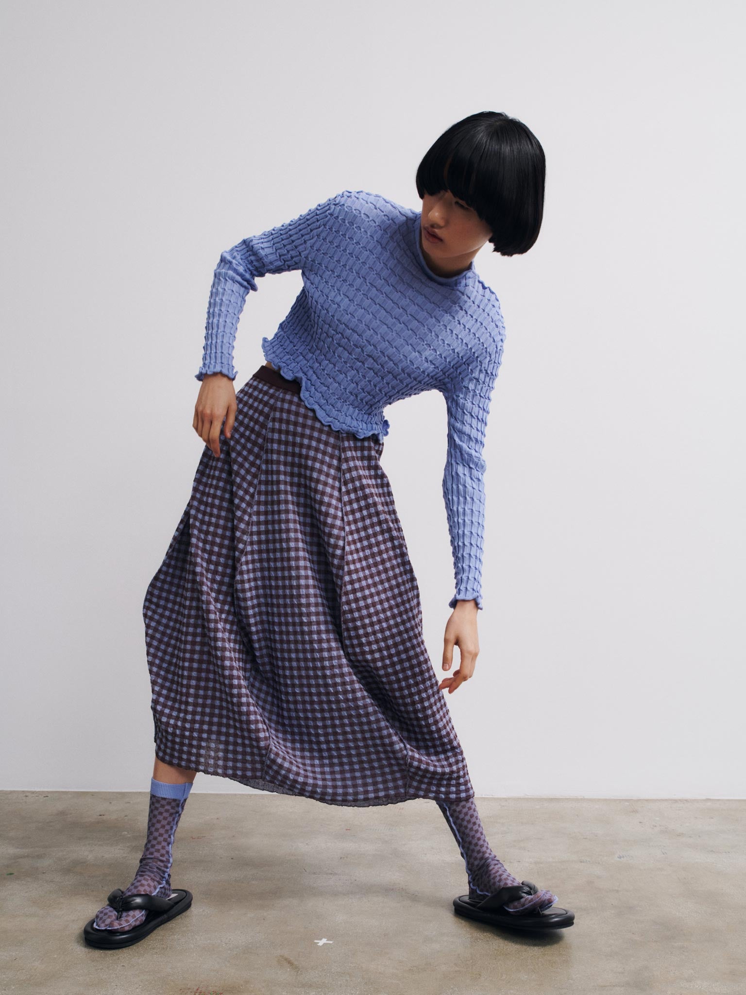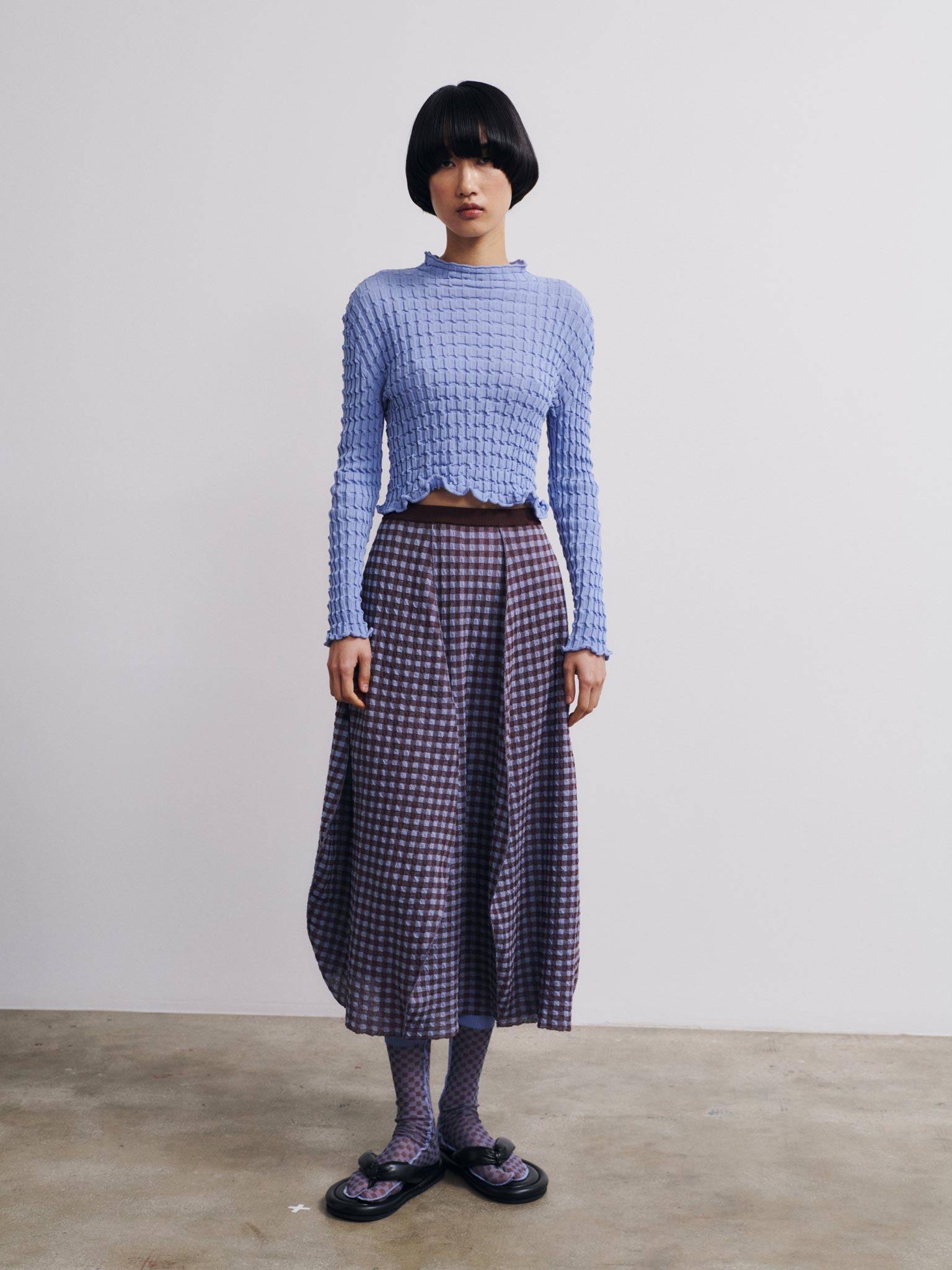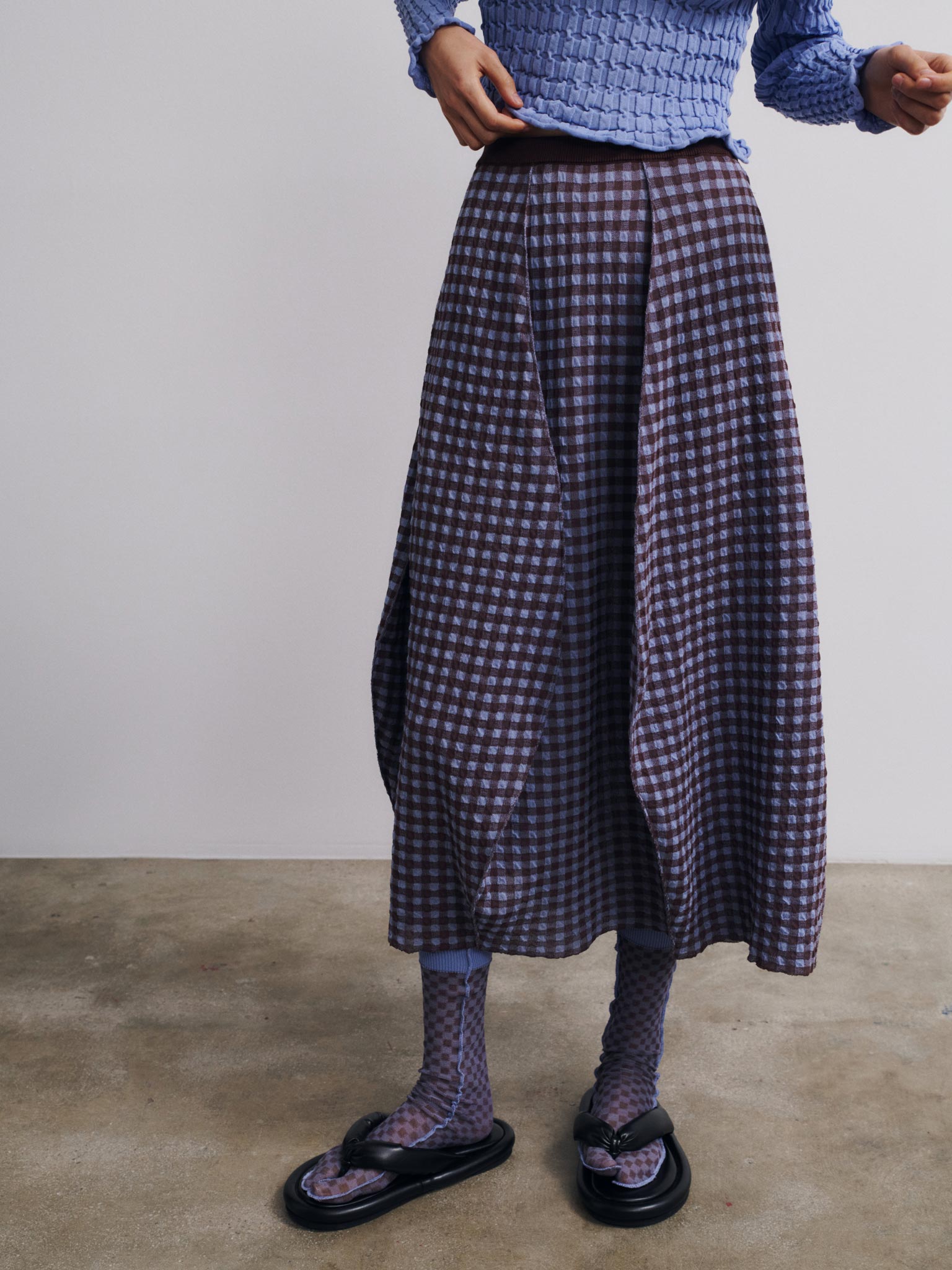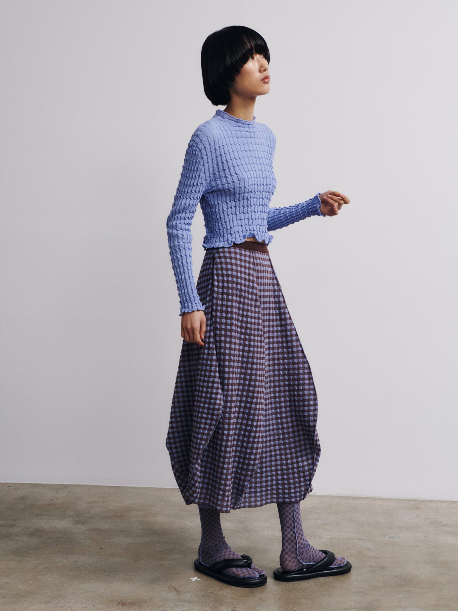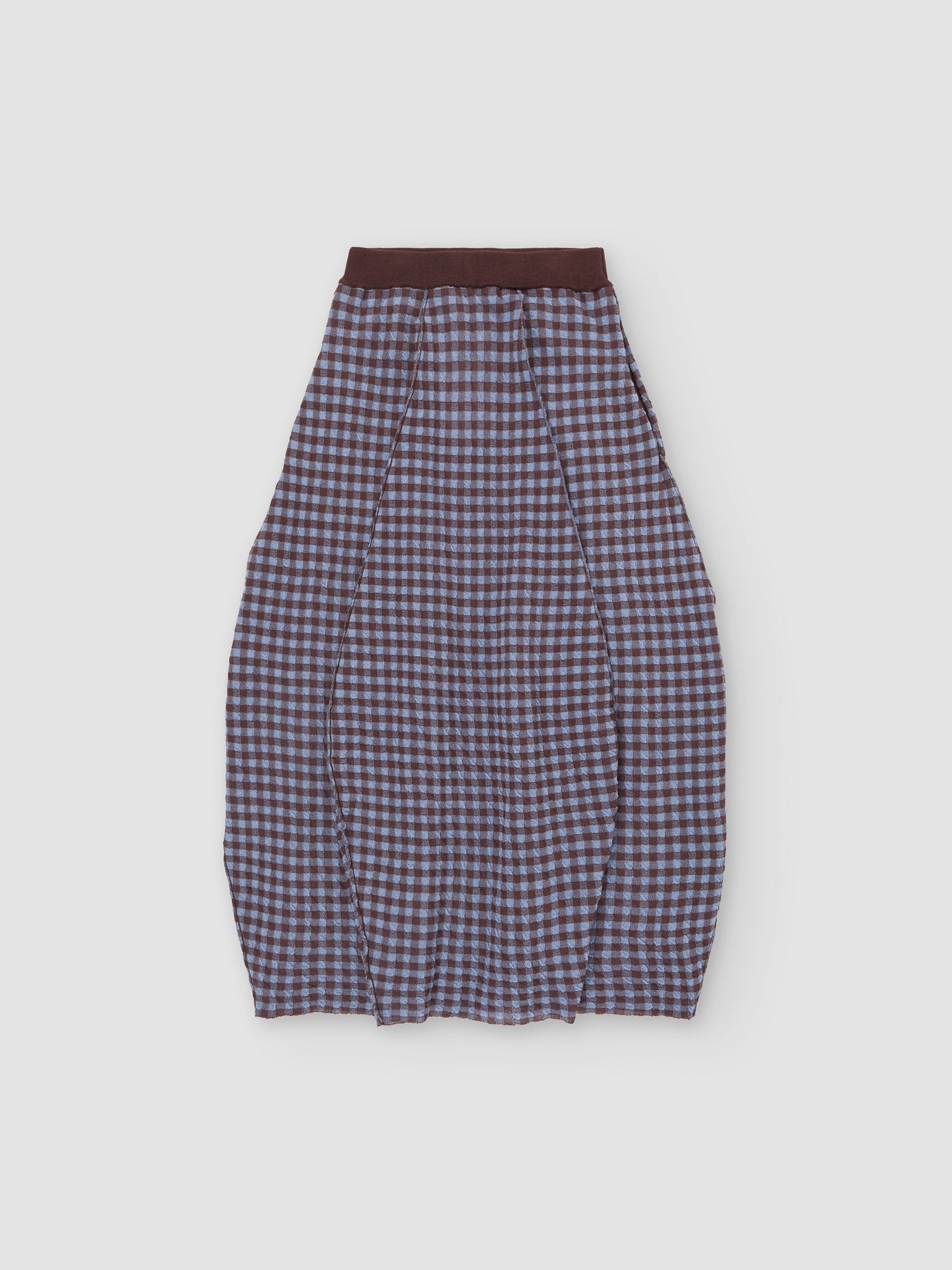 Balloon midi skirt crafted in a lightweight gingham two-tone textured jacquard, knitted from ultrafine makò cotton. Rounded panelled structure featuring exposed seams, side pockets and a ribbed elasticated waistband.