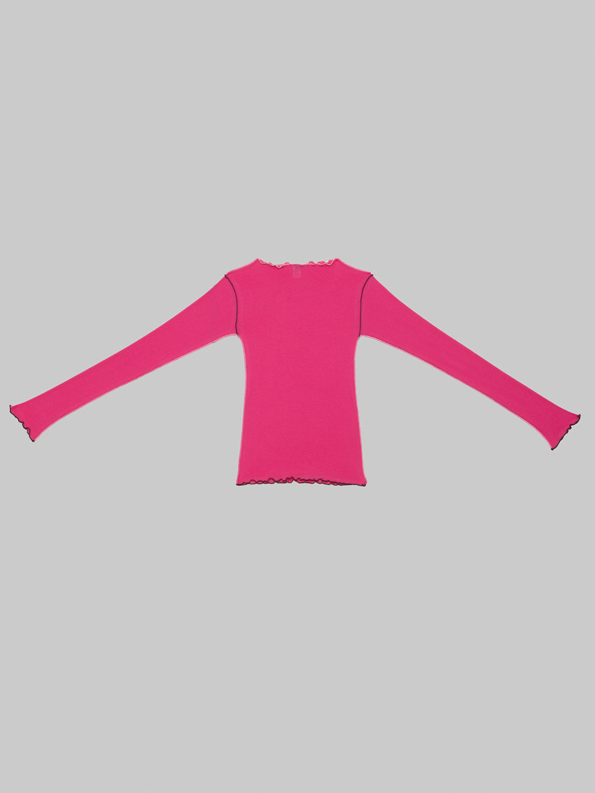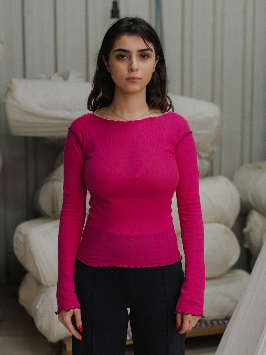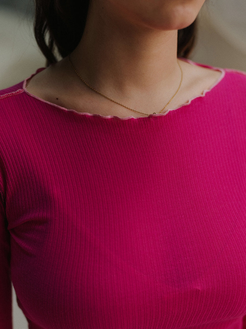 Organic cotton rib long sleeve tee with boatneck and exposed contrast seams.