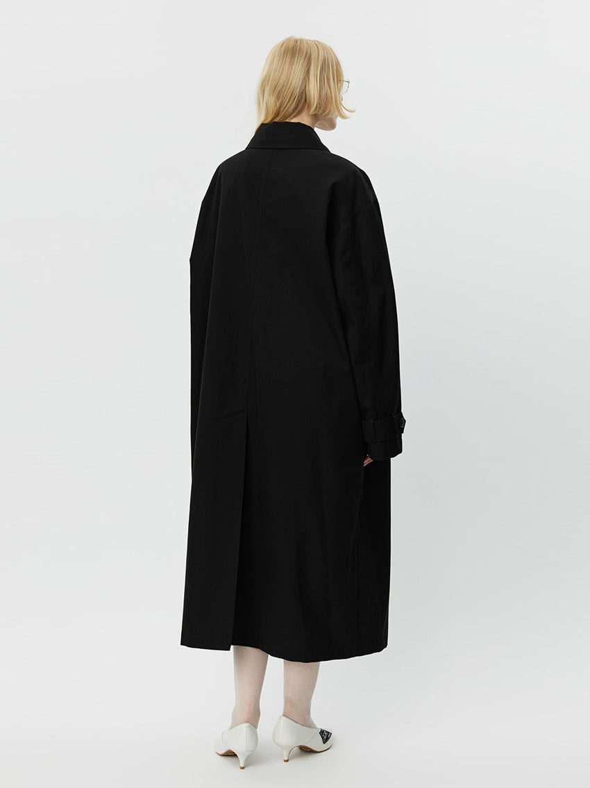 The Venture Coat is calf length with a relaxed fit and drop shoulders.