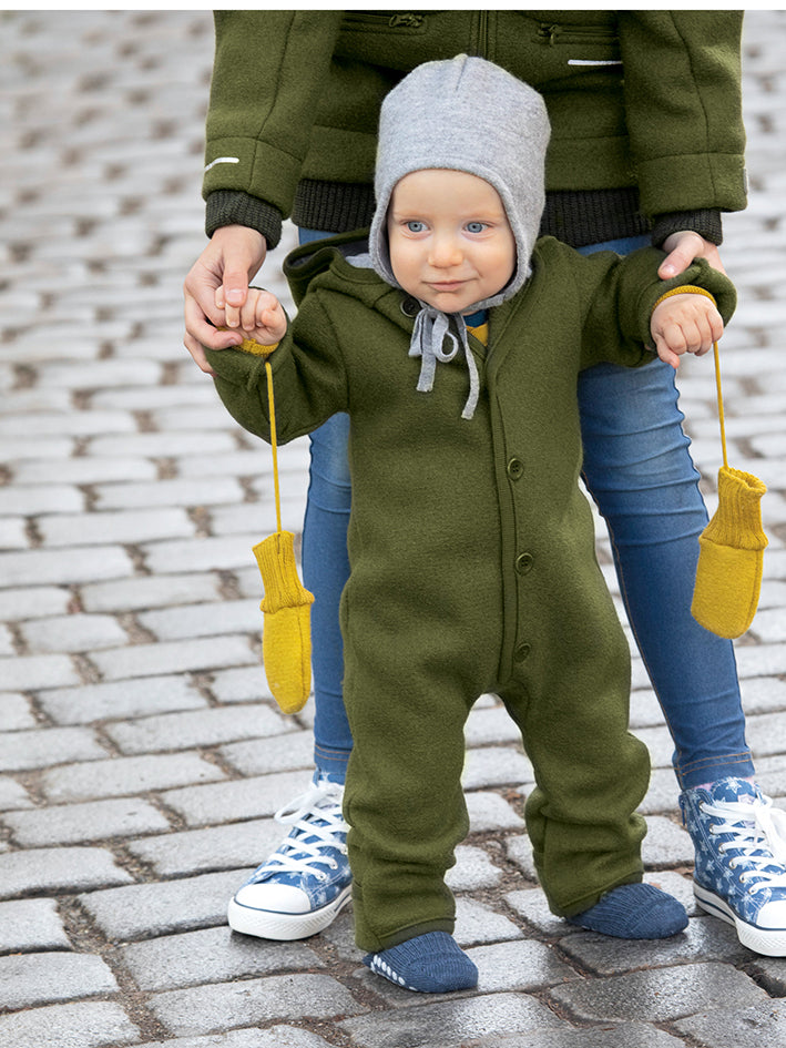 Soft and warm Disana Walk Overall with hoodie, made of boiled organic wool. The robust organic wool protects against wind, rain and cold. The soft jersey lining in the hood and neck (100% organic cotton) is ideal for sensitive baby skin. An ideal garment for babies and children who want to play outside in the cold months! The opening from neck down make it easy to put it on and off. The overall has a cover on both sleeves and legs, keeping hands and feet warm.
