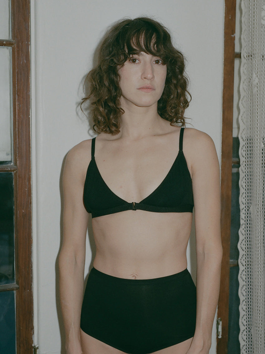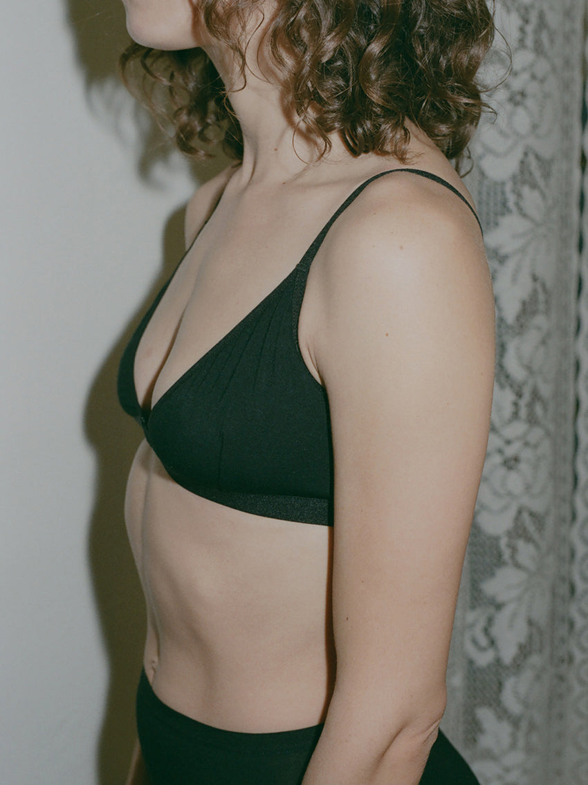 Bamboo jersey bra with darts at chest and elastic trim at straps and hem.