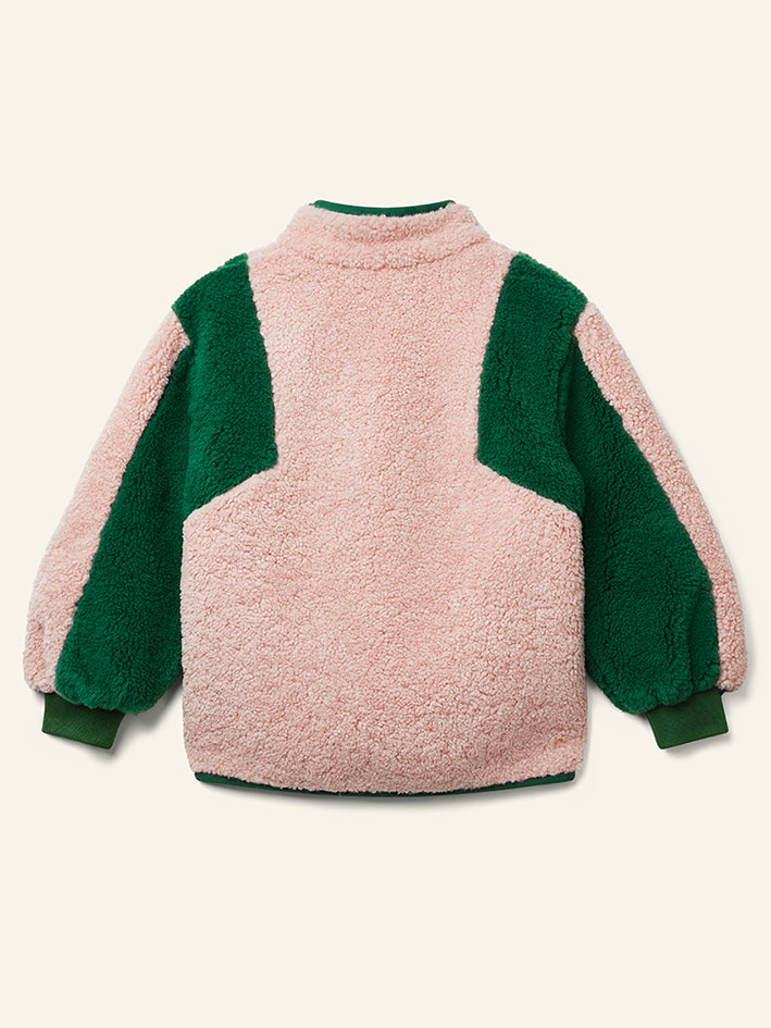 Crafted from supremely soft teddy fur, this zip-up Wilderness Jacket in Blush Pink and Python Green is a cosy go-to for chilly days. Built for comfort and everyday wear, it features an extremely soft and lightweight lining, ribbed cuffs, and deep pockets—perfect for stashing little treasures. It's an effortless layering essential for little trendsetters, and a true Wynken signature piece.