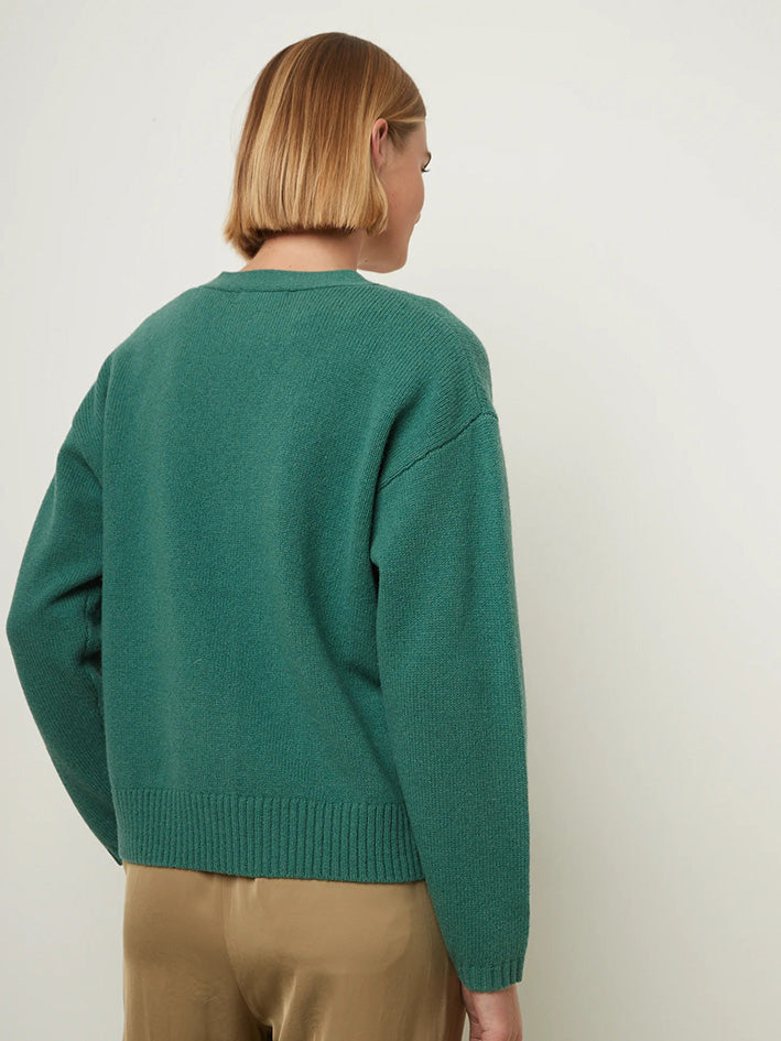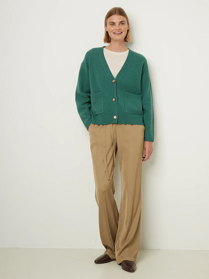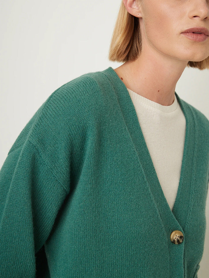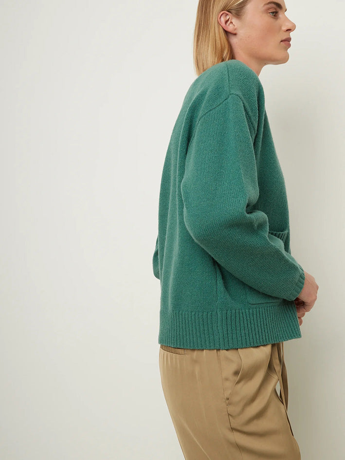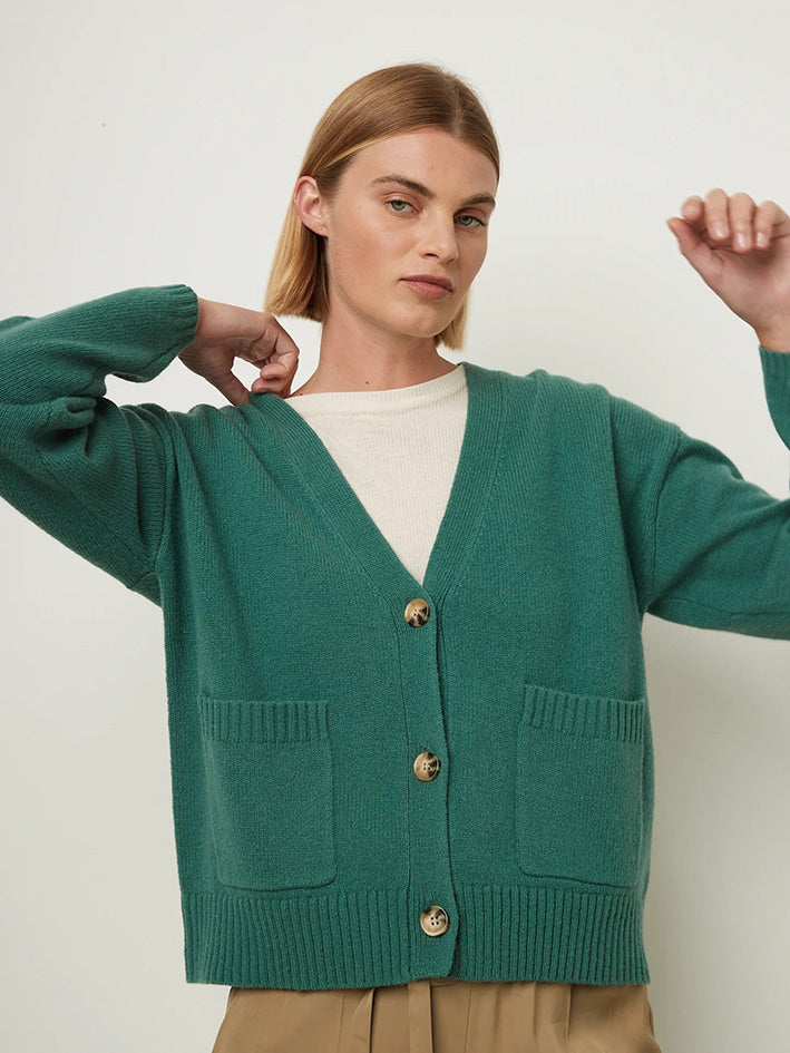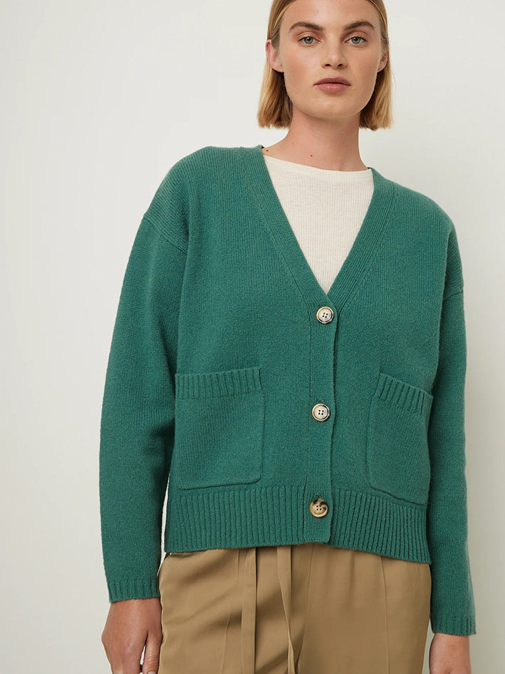 This V-neck Wool Cardigan in Green by Rue Blanche is knitted from a pure wool, sturdy yarn for extra warmth in a mid petrol-green hue. It is designed for a casual fit and features dropped shoulders. Its details include two front patch pockets, and ribbed details.