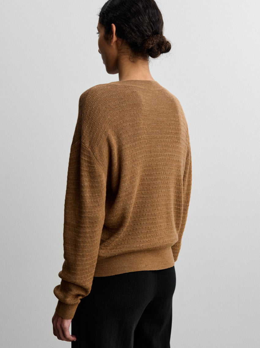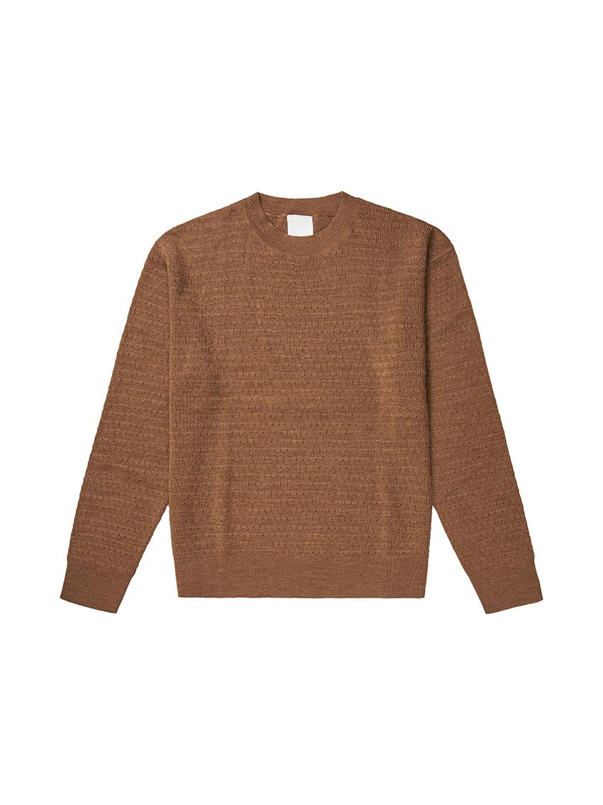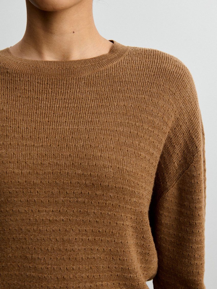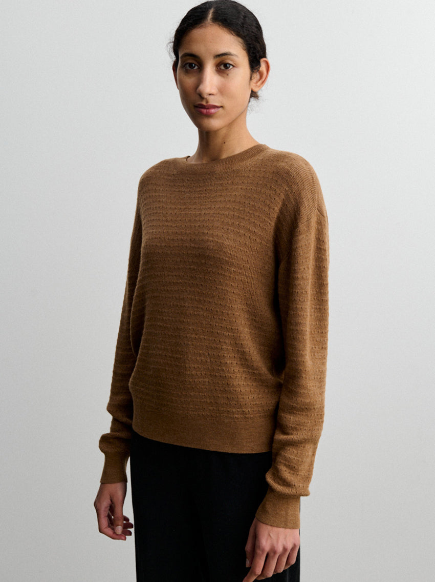 Knitted in fine merino Wool this Sweater in Camel Melange by Fub is designed with slightly dropped shoulders, a round ribbed neckline with a subtle pointelle detail and ribbed hems.