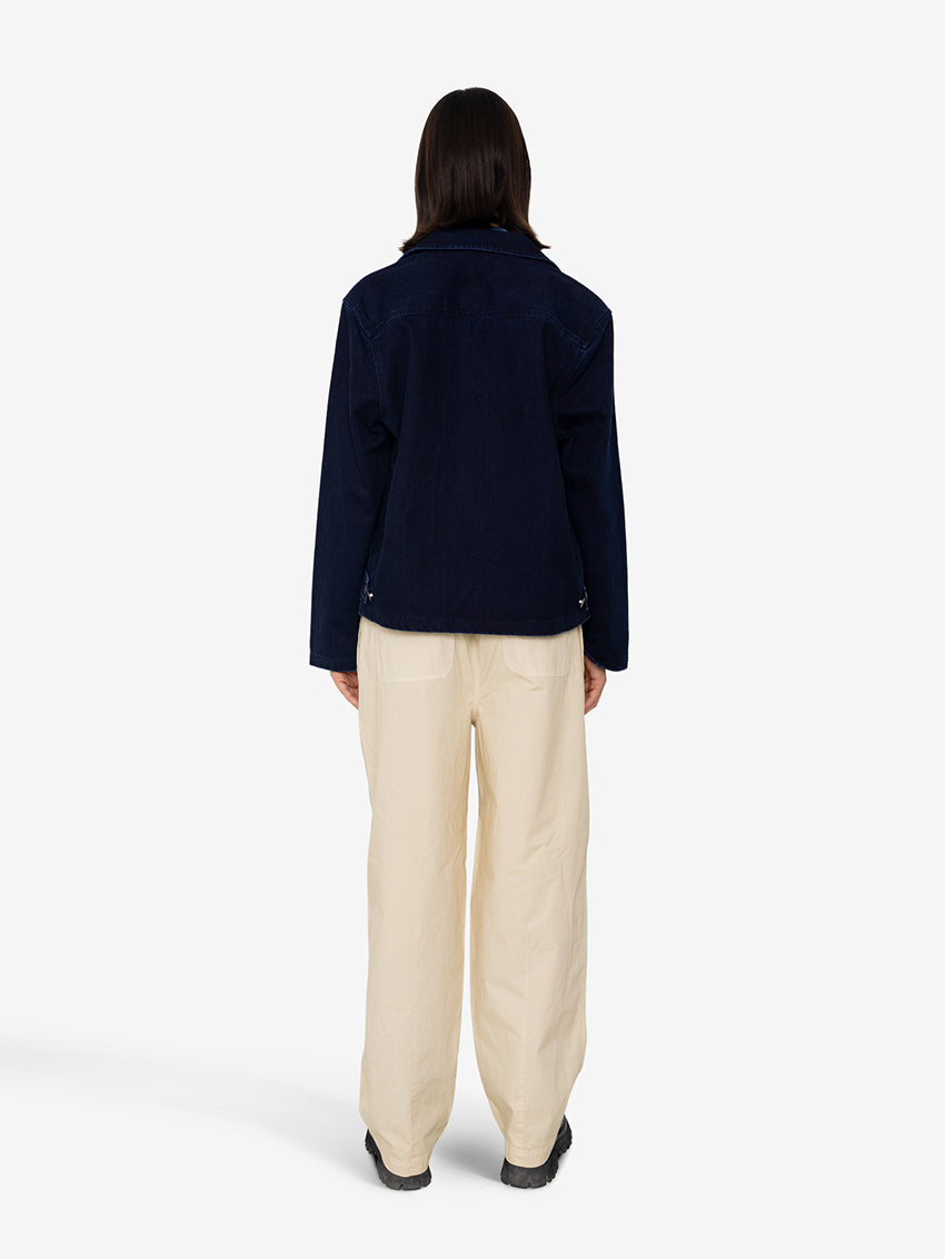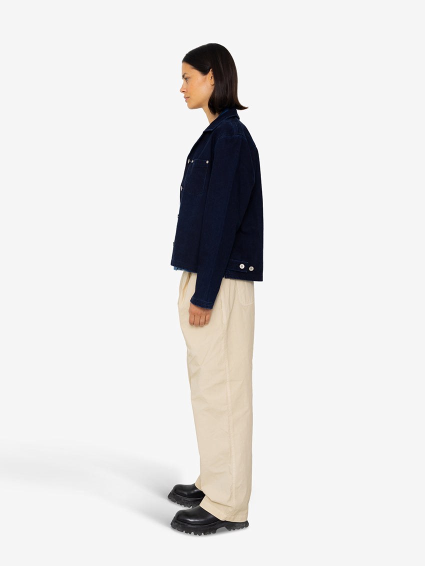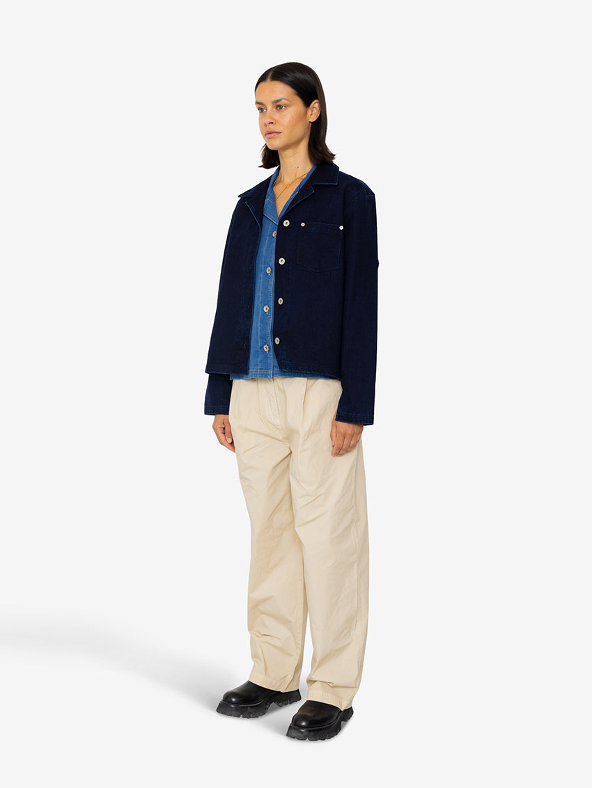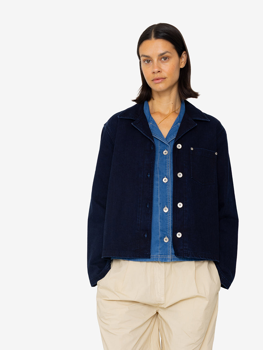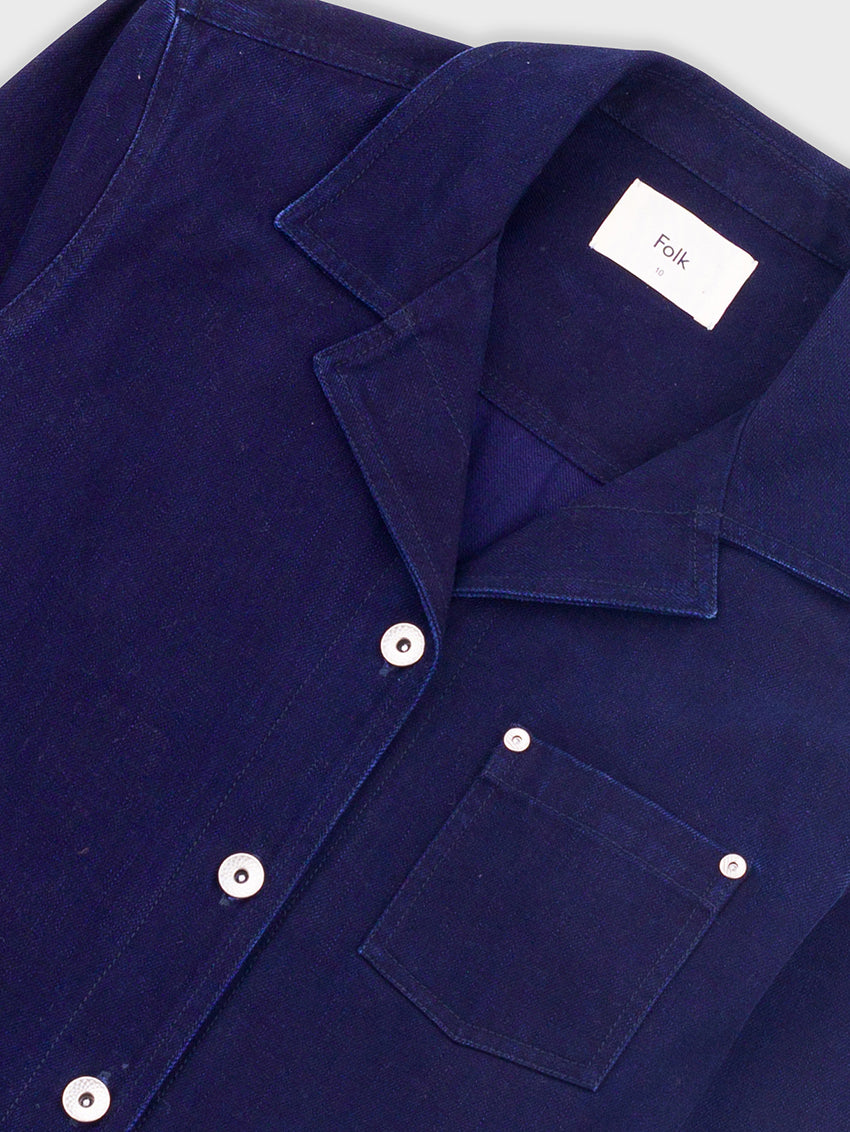 A boxy, relaxed fitting Worker Overshirt in Deep Indigo Slub by Folk, gently cropped with patch pocket detail.