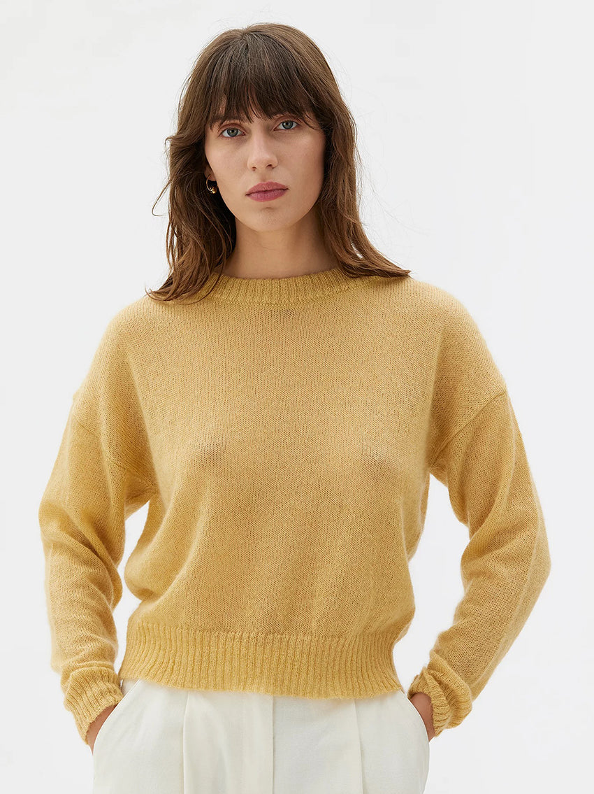 Indulge in the exquisite comfort of the crew neck Yara Sweater in Pale Yellow by Maska, meticulously crafted from an Italian Silk Mohair blend, offering a sumptuously soft hand feel. This style embodies relaxed sophistication with its loose, relaxed fit, dropped shoulders, and finely ribbed crewneck, cuffs, and hem. This airy knit sweater offers both style and practicality, making it the perfect choice for all seasons. Whether you're layering up for cooler months or seeking lightweight comfort in warmer weather, the Yara sweater effortlessly transitions with the wardrobe. Composition: 73% Mohair, 27% Silk. Made in Bulgaria.